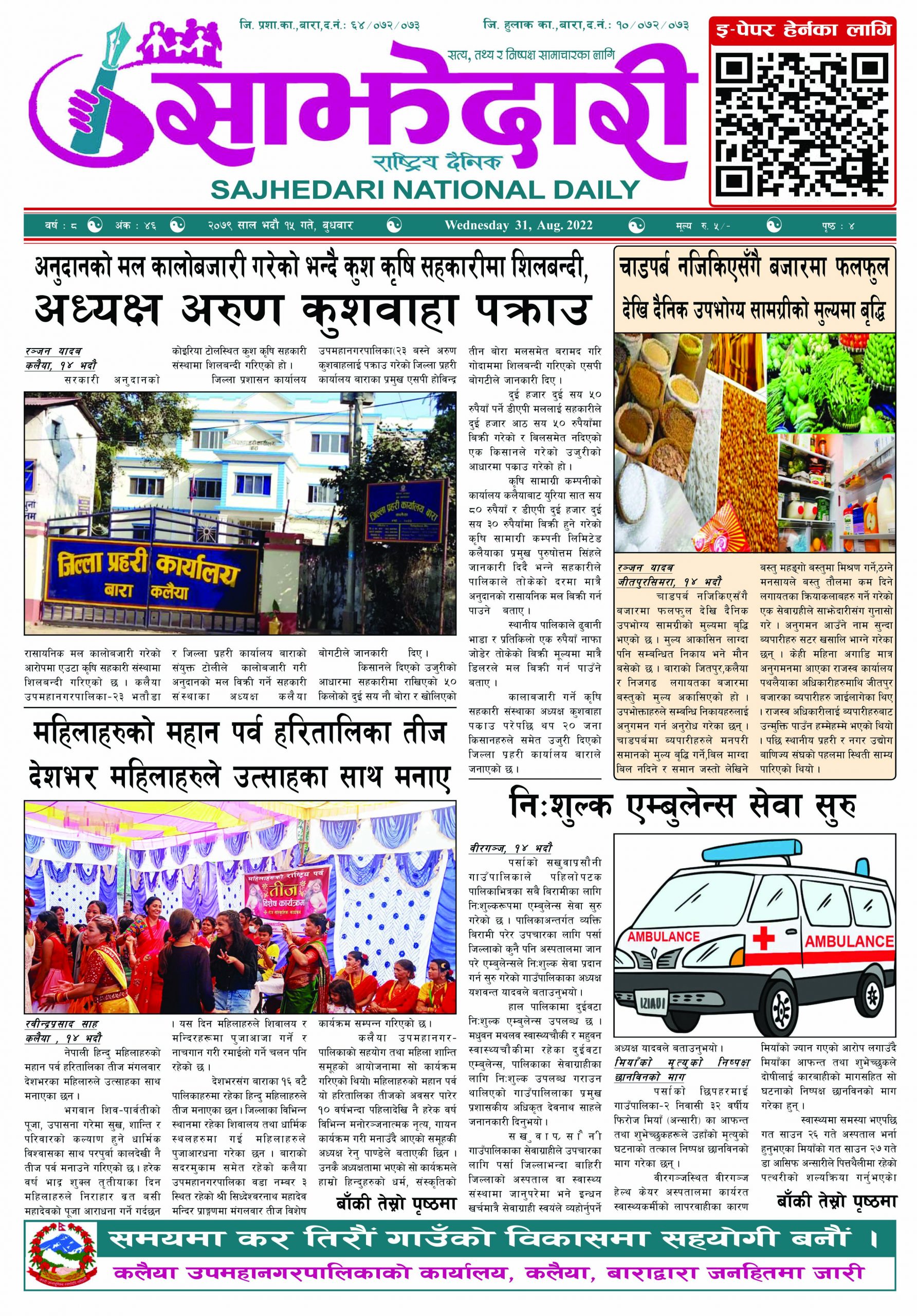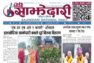 ई–पेपर २०७९ बैशाख ०२ गते । साझेदारी दैनिक साझेदारी दैनिक २०७९ बैशाख ९, गते 557 पाठक संख्या शेयर शेयर Leave a review Leave a review Leave a Review Cancel replyYour email address will not be published. Required fields are marked * Please select a rating! Your Rating Rate… Perfect Good Average Not that Bad Very Poor Your Comment *नाम * Your Email * Your website Save my name, email, and website in this browser for the next time I comment. ताजा अपडेट कलैयामा घरको ताला तोडेर करिब ५० लाख बराबरको चोरी मधेश मुख्य समाचार समाचार प्रधानमन्त्री कप क्रिकेटको उपाधि त्रिभुवन आर्मी क्लबलाई खेलकुद मधेश मुख्य समाचार समाचार लागुऔषधसहित विभिन्न स्थानबाट २४ जना पक्राउ प्रदेश समाचार समाचार सुनचाँदीको मूल्य घट्यो समाचार भन्सार छली प्रकरणः तीन जनाविरुद्ध अदालतमा मुद्दा, मुख्य अभियुक्तबाट २ करोडभन्दा बढी बिगो दाबी मधेश मुख्य समाचार समाचार जीतपुरको गौशाला जग्गा अतिक्रमण घरटहरा हटाइयो मधेश मुख्य समाचार समाचार बारामा भूतपूर्व सैनिक पुनर्मिलन कार्यक्रम सम्पन्न मधेश समाचार मुख्य समाचार पाँच पटक भन्दाबढी ट्राफिक नियम उल्लंघन गर्नेको लाइसेन्स निलम्बन प्रक्रिया सुरु मधेश मुख्य समाचार समाचार बाराका दुई नगरपालिकामा नयाँ प्रमुख प्रशासकीय अधिकृत खटाइए मधेश मुख्य समाचार समाचार पर्सामा नागरिकतासँगै राष्ट्रिय परिचयपत्र मधेश मुख्य समाचार समाचार राजश्व अनुसन्धान कार्यालय पथलैयामा आगलागी, प्रमुखको कार्यकक्ष ध्वस्त मधेश समाचार भाडा वृद्धि पछि सिमरा-काठमाडौं उडानमा यात्रु घटे मधेश मुख्य समाचार समाचार प्रदेश समाचार बारामा साढे दुई महिनामा एक करोडभन्दा बढीको अवैध सामान बरामद मधेश मुख्य समाचार समाचार सांसद साहलाई जीतपुरसिमरा-१७ का वडाबासीद्वारा ध्यानाकर्षणपत्र बुझाइयो मधेश मुख्य समाचार समाचार प्रधानमन्त्री कपको आजको खेलमा मधेस प्रदेश विजयी खेलकुद मधेश समाचार स्थानीय तहसँग मागियो विद्यालय समायोजनको विवरण प्रदेश समाचार समाचार होटेल करण राज प्यालेसमा आधुनिक सुविधासहित स्विमिङ पुल उद्घाटन मधेश मुख्य समाचार समाचार