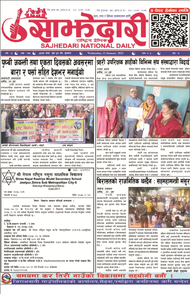 ई–पेपर २०७९ असोज २८ गते । साझेदारी दैनिक साझेदारी दैनिक २०७९ आश्विन २९, गते 465 पाठक संख्या शेयर शेयर Leave a review Leave a review Leave a Review Cancel replyYour email address will not be published. Required fields are marked * Please select a rating! Your Rating Rate… Perfect Good Average Not that Bad Very Poor Your Comment *नाम * Your Email * Your website Save my name, email, and website in this browser for the next time I comment. ताजा अपडेट तेइस लाख बालकालिकालाई भिटामिन ‘ए’ खुवाइयो समाचार स्वास्थ्य पर्सामा लागूऔषध गाँजा जस्तो पदार्थसहित चार भारतीय नागरिक पक्राउ मधेश समाचार चक्कु प्रहार गरी युवकको हत्या समाचार बनावटी अडियो काण्ड : प्रहरी वरिष्ठ नायव निरीक्षक सागर शमसेर ज.ब.रा. निलम्बन प्रक्रियामा मधेश मुख्य समाचार समाचार १९ औं स्थापना दिवसको अवसरमा ३७ जनाद्वारा रक्तदान मधेश समाचार वीरगञ्ज भन्सारद्वारा नौ महिनामा एक खर्ब ७७ करोड राजस्व सङ्कलन मधेश समाचार व्यवसाय सञ्चालनमा पारदर्शिता र नियम पालना गर्न जीतपुरसिमरा उद्योग वाणिज्य संघको आग्रह मधेश समाचार मुख्य समाचार पथलैया-चुरियामाई सडक क्षेत्रका संरचना हटाउन ३ दिनको अल्टिमेटम मधेश मुख्य समाचार समाचार सिमरामा ‘केआईईसी’को नयाँ शाखा सञ्चालन,विदेश अध्ययन चाहने विद्यार्थीलाई सहज मधेश मुख्य समाचार समाचार पहिलेको निर्णय फेरियो : कलैयामा अब वैशाख १६ देखि कक्षा सुरु हुने मधेश मुख्य समाचार समाचार कलैयामा वैशाख १५ गतेदेखि भर्ना अभियान, २१ गतेदेखि पठनपाठन सुरु हुने मधेश मुख्य समाचार समाचार पर्सा राष्ट्रिय निकुञ्जमा वन्यजन्तु उद्धार केन्द्र उद्घाटन मधेश समाचार प्रदेश समाचार कलैयामा खसी मासुको छालासहित र बिना छालाको छुट्टाछुट्टै मूल्य निर्धारण मधेश समाचार सिम्रौनगढमा छाडा कुकुरको आतंक : एकै घरका ८ खसी-बाख्रा मरे मधेश मुख्य समाचार समाचार रेल्वे सेवा ७९ करोड ऋणमा मधेश समाचार सडक विस्तारले वीरगञ्जको विद्युत् अवरुद्ध मधेश मुख्य समाचार समाचार बाईपास विस्तारका लागि २४ घण्टाभित्र संरचना हटाउन वीरगञ्ज महानगरको निर्देशन मधेश मुख्य समाचार समाचार