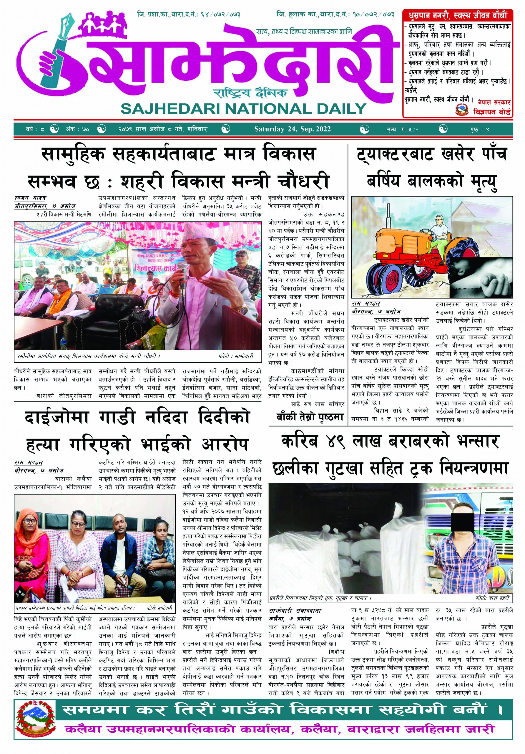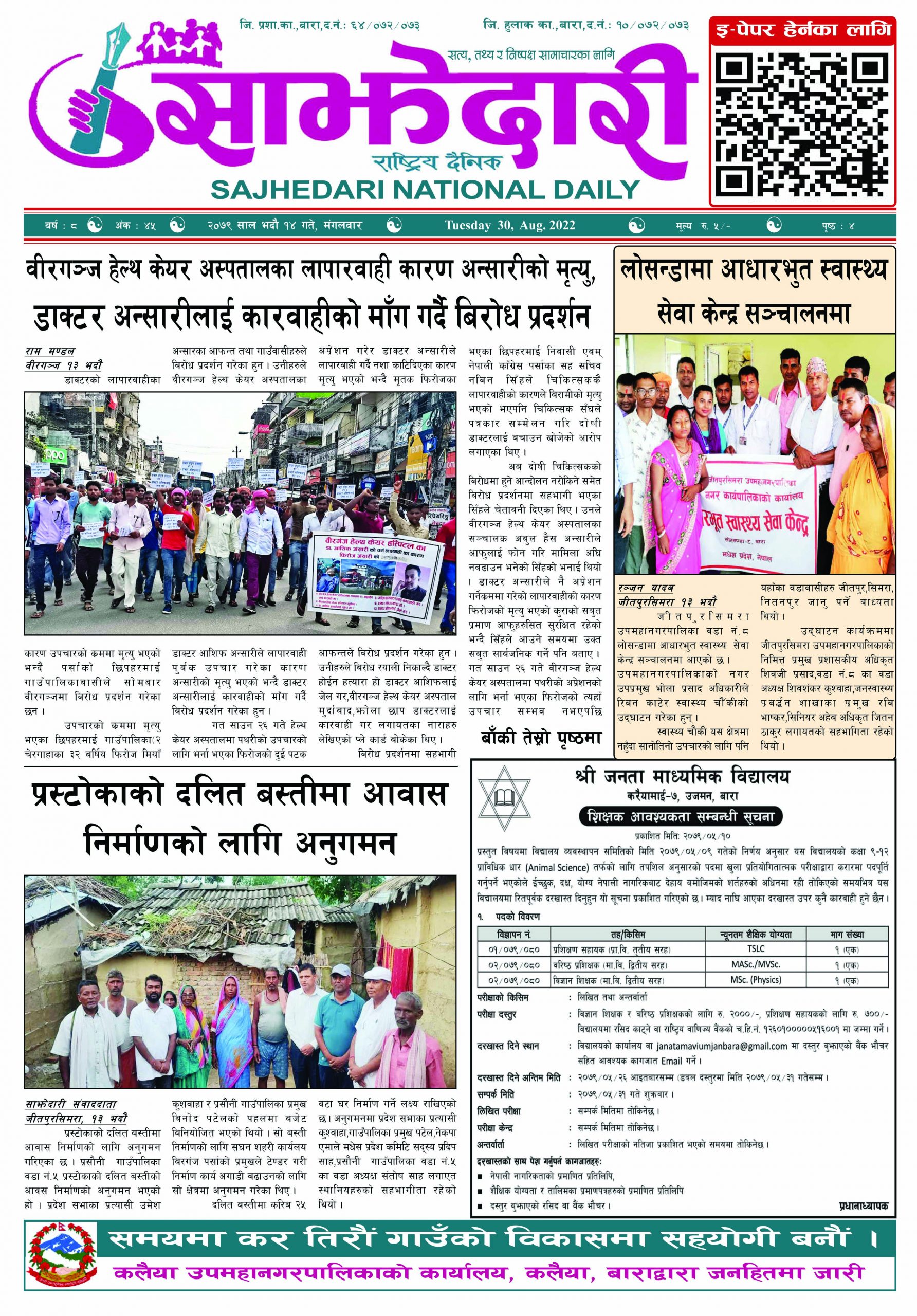 ई–पेपर २०७९ पुस २१ गते । साझेदारी दैनिक साझेदारी दैनिक २०७९ पुष २१, गते 601 पाठक संख्या शेयर Leave a review Leave a review Leave a Review Cancel replyYour email address will not be published. Required fields are marked * Please select a rating! Your Rating Rate… Perfect Good Average Not that Bad Very Poor Your Comment *नाम * Your Email * Your website Save my name, email, and website in this browser for the next time I comment. ताजा अपडेट चन्द्रपुरको शान्तिनगरमा धर्म जागनी महोत्सव हुदै, भोली शोभा यात्रा मधेश मुख्य समाचार समाचार कलैयामा बृहत् रक्तदान : ३ महिलासहित ५४ जनाले गरे रक्तदान मधेश मुख्य समाचार समाचार कोल्हवीमा नगर प्रमुख चौधरीद्वारा चार कोठे विद्यालय भवनको उद्घाटन मधेश समाचार स्वच्छ, निष्पक्ष र भयरहित वातावरणमा निर्वाचन गराउन सुरक्षाको सम्पूर्ण तयारी पूराः प्रजिअ मिश्र मधेश मुख्य समाचार समाचार प्रसौनी गाउँपालिका बारामा प्रथम र प्रदेशकै दोस्रो स्थानमा मधेश समाचार अधुरा काम पूरा गर्ने अभियान लिएर मैदानमा उत्रिए जसपा उम्मेदवार यादव मधेश राजनीति समाचार एभरग्रिन अस्पतालमा बालबालिकाको शैक्षिक प्रदर्शनी सम्पन्न मधेश समाचार मुख्य समाचार बारा- १ मा अन्तरिक मतभेदले काँग्रेसलाई चुनौती,पुर्वमन्त्री चौधरीको मौनताले उम्मेदवार बुढाथोकी दबाबमा मधेश मुख्य समाचार राजनीति समाचार वीरगञ्जमा सशस्त्र प्रहरीमाथि आक्रमण गर्ने छ जना पक्राउ मधेश समाचार कोल्हवीमा विपद ब्यवस्थापन कोष संचालन कार्यबिधि सम्बन्धी कार्यशाला सम्पन्न मधेश समाचार पकहाँमैनपुर गाउँपालिकाका अध्यक्षको कार्यशैलीप्रति कर्मचारी असन्तुष्ट, सेवा अवरुद्ध गर्ने चेतावनी मधेश मुख्य समाचार समाचार अख्तियार बर्दिवास कार्यालयमा धनुषाका उजुरी धेरै मधेश समाचार प्रदेश समाचार आमाको नामबाट बारामा दुई जनाले पाए अङ्गीकृत नागरिकता मधेश मुख्य समाचार समाचार रामपुरमा रास्वपा उम्मेदवार ई. अरविन्द साहको घरदैलो मधेश राजनीति समाचार बसतपुरमा जसपा उम्मेदवार यादवको मतदाता भेटघाट मधेश राजनीति समाचार आजपा उम्मेदवार विजय यादव ‘निर्विज’को चुनावी प्रतिबद्धता पत्र सार्वजनिक मधेश राजनीति समाचार रास्वपाका वरिष्ठ नेता चुनावी प्रचार अभियान बुधबार बारामा मधेश समाचार