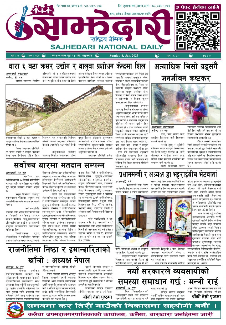 ई–पेपर २०७९ पुस २४ गते । साझेदारी दैनिक साझेदारी दैनिक २०७९ पुष २५, गते 387 पाठक संख्या शेयर शेयर Leave a review Leave a review Leave a Review Cancel replyYour email address will not be published. Required fields are marked * Please select a rating! Your Rating Rate… Perfect Good Average Not that Bad Very Poor Your Comment *नाम * Your Email * Your website Save my name, email, and website in this browser for the next time I comment. ताजा अपडेट रास्वपाको महामन्त्रीमा शाह मनोनित राजनीति समाचार पहिलेको निर्णय फेरियो : कलैयामा अब वैशाख १६ देखि कक्षा सुरु हुने मधेश मुख्य समाचार समाचार कलैयामा वैशाख १५ गतेदेखि भर्ना अभियान, २१ गतेदेखि पठनपाठन सुरु हुने मधेश मुख्य समाचार समाचार पेट्रोलियम पदार्थमा गरिएको मूल्य वृद्धि फिर्ता लिन अध्यक्ष घिसिङको माग समाचार पर्सा राष्ट्रिय निकुञ्जमा वन्यजन्तु उद्धार केन्द्र उद्घाटन मधेश समाचार कलैयामा खसी मासुको छालासहित र बिना छालाको छुट्टाछुट्टै मूल्य निर्धारण मधेश समाचार सिम्रौनगढमा छाडा कुकुरको आतंक : एकै घरका ८ खसी-बाख्रा मरे मधेश मुख्य समाचार समाचार मुख्य समाचार रेल्वे सेवा ७९ करोड ऋणमा मधेश समाचार सडक विस्तारले वीरगञ्जको विद्युत् अवरुद्ध मधेश मुख्य समाचार समाचार बाईपास विस्तारका लागि २४ घण्टाभित्र संरचना हटाउन वीरगञ्ज महानगरको निर्देशन मधेश मुख्य समाचार समाचार वीरगञ्जमा भर्ना अभियान वैशाख ७ गतेदेखि सुरु हुने मधेश समाचार वीरगन्जमा अतिक्रमित संरचना भत्काउन सुरु मधेश मुख्य समाचार समाचार प्रदेश समाचार जीतपुरसिमराको बिद्यालयमा पठनपाठन वैशाख १४ गते देखि सुरु हुने मधेश मुख्य समाचार समाचार करैयामाई -६ सिहोर्वामा नि:शुल्क स्वास्थ्य शिविर सम्पन्न मधेश समाचार स्वास्थ्य बारामा खेतबाट घर फर्किँदै गर्दा चट्याङ लागेर एक जनाको मृत्यु मधेश मुख्य समाचार समाचार बृन्दावनमा ६ सुकुम्बासी परिवार विस्थापित मधेश समाचार सुनसरीमा काँचो केरासहित चार जना पक्राउ मधेश मुख्य समाचार समाचार