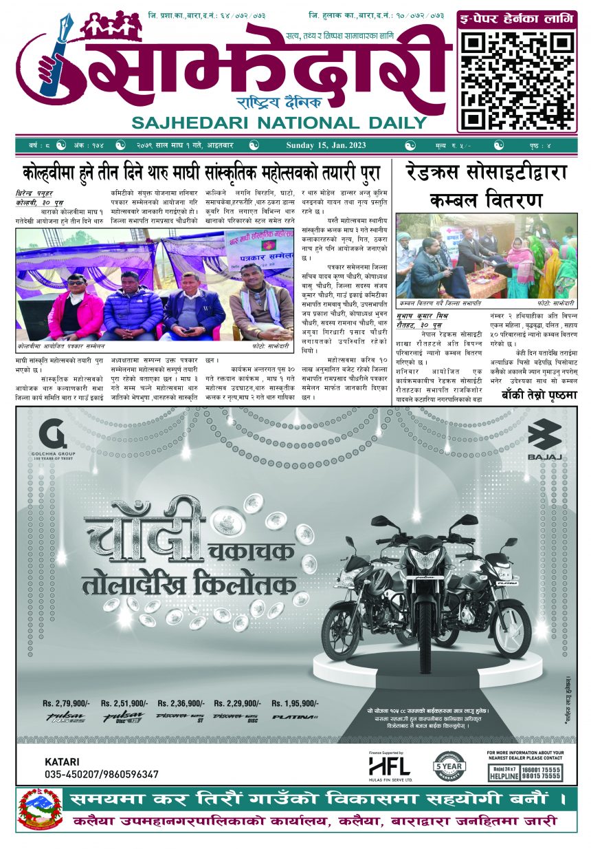 ई–पेपर २०७९ माघ ०१ गते । साझेदारी दैनिक साझेदारी दैनिक २०७९ माघ १, गते 448 पाठक संख्या शेयर शेयर Leave a review Leave a review Leave a Review Cancel replyYour email address will not be published. Required fields are marked * Please select a rating! Your Rating Rate… Perfect Good Average Not that Bad Very Poor Your Comment *नाम * Your Email * Your website Save my name, email, and website in this browser for the next time I comment. ताजा अपडेट २०८३ वैशाख ०५ गते । साझेदारी दैनिक ई–पेपर दुर्घटना न्यूनीकरणलाई केन्द्रमा राखेर काम गर्न डीआईजी थपलियाको निर्देशन मधेश मुख्य समाचार समाचार कलैयामा घरको ताला तोडेर करिब ५० लाख बराबरको चोरी मधेश मुख्य समाचार समाचार प्रधानमन्त्री कप क्रिकेटको उपाधि त्रिभुवन आर्मी क्लबलाई खेलकुद मधेश मुख्य समाचार समाचार लागुऔषधसहित विभिन्न स्थानबाट २४ जना पक्राउ प्रदेश समाचार समाचार सुनचाँदीको मूल्य घट्यो समाचार भन्सार छली प्रकरणः तीन जनाविरुद्ध अदालतमा मुद्दा, मुख्य अभियुक्तबाट २ करोडभन्दा बढी बिगो दाबी मधेश मुख्य समाचार समाचार मुख्य समाचार जीतपुरको गौशाला जग्गा अतिक्रमण घरटहरा हटाइयो मधेश मुख्य समाचार समाचार बारामा भूतपूर्व सैनिक पुनर्मिलन कार्यक्रम सम्पन्न मधेश समाचार पाँच पटक भन्दाबढी ट्राफिक नियम उल्लंघन गर्नेको लाइसेन्स निलम्बन प्रक्रिया सुरु मधेश मुख्य समाचार समाचार बाराका दुई नगरपालिकामा नयाँ प्रमुख प्रशासकीय अधिकृत खटाइए मधेश मुख्य समाचार समाचार पर्सामा नागरिकतासँगै राष्ट्रिय परिचयपत्र मधेश मुख्य समाचार समाचार प्रदेश समाचार राजश्व अनुसन्धान कार्यालय पथलैयामा आगलागी, प्रमुखको कार्यकक्ष ध्वस्त मधेश समाचार भाडा वृद्धि पछि सिमरा-काठमाडौं उडानमा यात्रु घटे मधेश मुख्य समाचार समाचार बारामा साढे दुई महिनामा एक करोडभन्दा बढीको अवैध सामान बरामद मधेश मुख्य समाचार समाचार सांसद साहलाई जीतपुरसिमरा-१७ का वडाबासीद्वारा ध्यानाकर्षणपत्र बुझाइयो मधेश मुख्य समाचार समाचार प्रधानमन्त्री कपको आजको खेलमा मधेस प्रदेश विजयी खेलकुद मधेश समाचार
