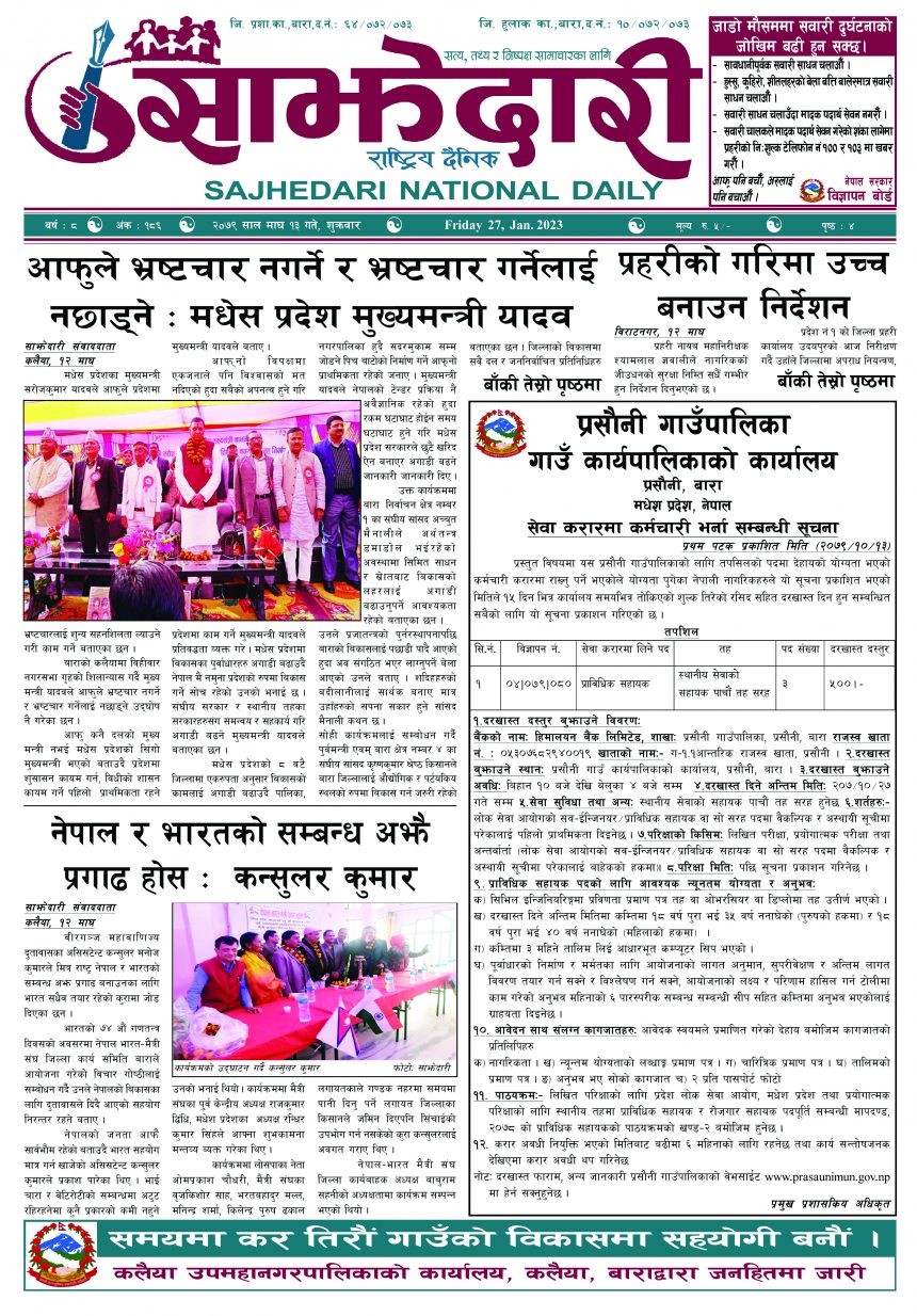 ई–पेपर २०७९ माघ १३ गते । साझेदारी दैनिक साझेदारी दैनिक २०७९ माघ १३, गते 531 पाठक संख्या शेयर शेयर Leave a review Leave a review Leave a Review Cancel replyYour email address will not be published. Required fields are marked * Please select a rating! Your Rating Rate… Perfect Good Average Not that Bad Very Poor Your Comment *नाम * Your Email * Your website Save my name, email, and website in this browser for the next time I comment. ताजा अपडेट वीरगञ्ज भन्सारद्वारा नौ महिनामा एक खर्ब ७७ करोड राजस्व सङ्कलन मधेश समाचार व्यवसाय सञ्चालनमा पारदर्शिता र नियम पालना गर्न जीतपुरसिमरा उद्योग वाणिज्य संघको आग्रह मधेश समाचार पथलैया-चुरियामाई सडक क्षेत्रका संरचना हटाउन ३ दिनको अल्टिमेटम मधेश मुख्य समाचार समाचार सिमरामा ‘केआईईसी’को नयाँ शाखा सञ्चालन,विदेश अध्ययन चाहने विद्यार्थीलाई सहज मधेश मुख्य समाचार समाचार २०८३ वैशाख ०८ गते । साझेदारी दैनिक ई–पेपर रास्वपाको महामन्त्रीमा शाह मनोनित राजनीति समाचार पहिलेको निर्णय फेरियो : कलैयामा अब वैशाख १६ देखि कक्षा सुरु हुने मधेश मुख्य समाचार समाचार मुख्य समाचार कलैयामा वैशाख १५ गतेदेखि भर्ना अभियान, २१ गतेदेखि पठनपाठन सुरु हुने मधेश मुख्य समाचार समाचार पर्सा राष्ट्रिय निकुञ्जमा वन्यजन्तु उद्धार केन्द्र उद्घाटन मधेश समाचार कलैयामा खसी मासुको छालासहित र बिना छालाको छुट्टाछुट्टै मूल्य निर्धारण मधेश समाचार सिम्रौनगढमा छाडा कुकुरको आतंक : एकै घरका ८ खसी-बाख्रा मरे मधेश मुख्य समाचार समाचार रेल्वे सेवा ७९ करोड ऋणमा मधेश समाचार प्रदेश समाचार सडक विस्तारले वीरगञ्जको विद्युत् अवरुद्ध मधेश मुख्य समाचार समाचार बाईपास विस्तारका लागि २४ घण्टाभित्र संरचना हटाउन वीरगञ्ज महानगरको निर्देशन मधेश मुख्य समाचार समाचार वीरगञ्जमा भर्ना अभियान वैशाख ७ गतेदेखि सुरु हुने मधेश समाचार वीरगन्जमा अतिक्रमित संरचना भत्काउन सुरु मधेश मुख्य समाचार समाचार जीतपुरसिमराको बिद्यालयमा पठनपाठन वैशाख १४ गते देखि सुरु हुने मधेश मुख्य समाचार समाचार