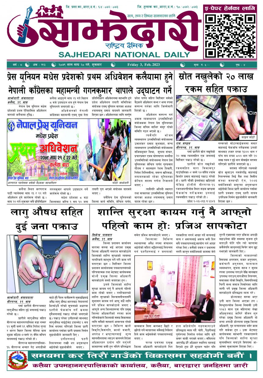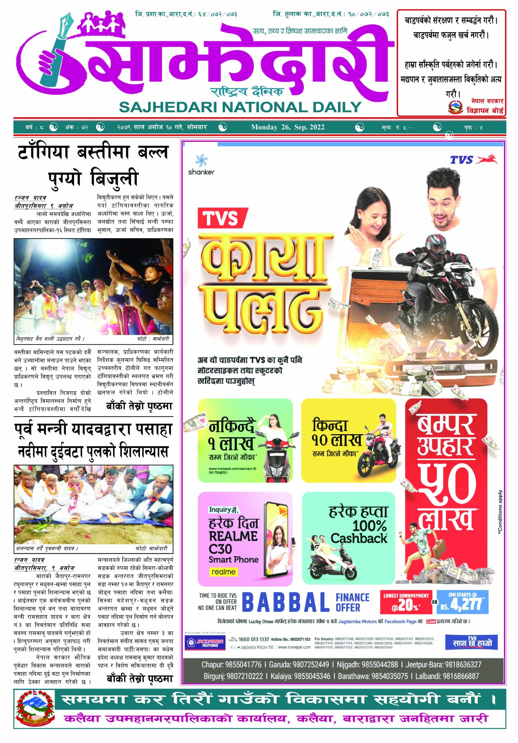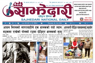 ई–पेपर २०७९ माघ २० गते । साझेदारी दैनिक साझेदारी दैनिक २०७९ माघ २४, गते 405 पाठक संख्या शेयर शेयर Leave a review Leave a review Leave a Review Cancel replyYour email address will not be published. Required fields are marked * Please select a rating! Your Rating Rate… Perfect Good Average Not that Bad Very Poor Your Comment *नाम * Your Email * Your website Save my name, email, and website in this browser for the next time I comment. ताजा अपडेट २०८३ वैशाख ०५ गते । साझेदारी दैनिक ई–पेपर दुर्घटना न्यूनीकरणलाई केन्द्रमा राखेर काम गर्न डीआईजी थपलियाको निर्देशन मधेश मुख्य समाचार समाचार कलैयामा घरको ताला तोडेर करिब ५० लाख बराबरको चोरी मधेश मुख्य समाचार समाचार प्रधानमन्त्री कप क्रिकेटको उपाधि त्रिभुवन आर्मी क्लबलाई खेलकुद मधेश मुख्य समाचार समाचार लागुऔषधसहित विभिन्न स्थानबाट २४ जना पक्राउ प्रदेश समाचार समाचार सुनचाँदीको मूल्य घट्यो समाचार भन्सार छली प्रकरणः तीन जनाविरुद्ध अदालतमा मुद्दा, मुख्य अभियुक्तबाट २ करोडभन्दा बढी बिगो दाबी मधेश मुख्य समाचार समाचार मुख्य समाचार जीतपुरको गौशाला जग्गा अतिक्रमण घरटहरा हटाइयो मधेश मुख्य समाचार समाचार बारामा भूतपूर्व सैनिक पुनर्मिलन कार्यक्रम सम्पन्न मधेश समाचार पाँच पटक भन्दाबढी ट्राफिक नियम उल्लंघन गर्नेको लाइसेन्स निलम्बन प्रक्रिया सुरु मधेश मुख्य समाचार समाचार बाराका दुई नगरपालिकामा नयाँ प्रमुख प्रशासकीय अधिकृत खटाइए मधेश मुख्य समाचार समाचार पर्सामा नागरिकतासँगै राष्ट्रिय परिचयपत्र मधेश मुख्य समाचार समाचार प्रदेश समाचार राजश्व अनुसन्धान कार्यालय पथलैयामा आगलागी, प्रमुखको कार्यकक्ष ध्वस्त मधेश समाचार भाडा वृद्धि पछि सिमरा-काठमाडौं उडानमा यात्रु घटे मधेश मुख्य समाचार समाचार बारामा साढे दुई महिनामा एक करोडभन्दा बढीको अवैध सामान बरामद मधेश मुख्य समाचार समाचार सांसद साहलाई जीतपुरसिमरा-१७ का वडाबासीद्वारा ध्यानाकर्षणपत्र बुझाइयो मधेश मुख्य समाचार समाचार प्रधानमन्त्री कपको आजको खेलमा मधेस प्रदेश विजयी खेलकुद मधेश समाचार