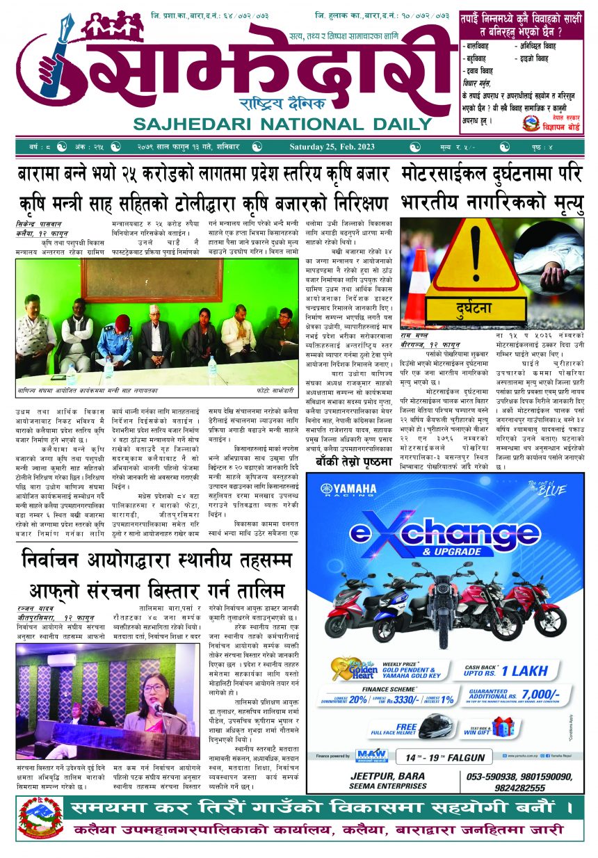 ई–पेपर २०७९ फागुन १३ गते । साझेदारी दैनिक साझेदारी दैनिक २०७९ फाल्गुन १५, गते 401 पाठक संख्या शेयर शेयर Leave a review Leave a review Leave a Review Cancel replyYour email address will not be published. Required fields are marked * Please select a rating! Your Rating Rate… Perfect Good Average Not that Bad Very Poor Your Comment *नाम * Your Email * Your website Save my name, email, and website in this browser for the next time I comment. ताजा अपडेट पेट्रोलियम पदार्थमा गरिएको मूल्य वृद्धि फिर्ता लिन अध्यक्ष घिसिङको माग समाचार पर्सा राष्ट्रिय निकुञ्जमा वन्यजन्तु उद्धार केन्द्र उद्घाटन मधेश समाचार कलैयामा खसी मासुको छालासहित र बिना छालाको छुट्टाछुट्टै मूल्य निर्धारण मधेश समाचार सिम्रौनगढमा छाडा कुकुरको आतंक : एकै घरका ८ खसी-बाख्रा मरे मधेश मुख्य समाचार समाचार २०८३ वैशाख ०७ गते । साझेदारी दैनिक ई–पेपर रेल्वे सेवा ७९ करोड ऋणमा मधेश समाचार सडक विस्तारले वीरगञ्जको विद्युत् अवरुद्ध मधेश मुख्य समाचार समाचार मुख्य समाचार बाईपास विस्तारका लागि २४ घण्टाभित्र संरचना हटाउन वीरगञ्ज महानगरको निर्देशन मधेश मुख्य समाचार समाचार वीरगञ्जमा भर्ना अभियान वैशाख ७ गतेदेखि सुरु हुने मधेश समाचार वीरगन्जमा अतिक्रमित संरचना भत्काउन सुरु मधेश मुख्य समाचार समाचार जीतपुरसिमराको बिद्यालयमा पठनपाठन वैशाख १४ गते देखि सुरु हुने मधेश मुख्य समाचार समाचार करैयामाई -६ सिहोर्वामा नि:शुल्क स्वास्थ्य शिविर सम्पन्न मधेश समाचार स्वास्थ्य प्रदेश समाचार बारामा खेतबाट घर फर्किँदै गर्दा चट्याङ लागेर एक जनाको मृत्यु मधेश मुख्य समाचार समाचार बृन्दावनमा ६ सुकुम्बासी परिवार विस्थापित मधेश समाचार सुनसरीमा काँचो केरासहित चार जना पक्राउ मधेश मुख्य समाचार समाचार दुर्घटना न्यूनीकरणलाई केन्द्रमा राखेर काम गर्न डीआईजी थपलियाको निर्देशन मधेश मुख्य समाचार समाचार कलैयामा घरको ताला तोडेर करिब ५० लाख बराबरको चोरी मधेश मुख्य समाचार समाचार