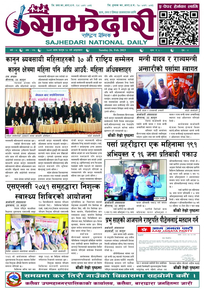 ई–पेपर २०७९ फागुन १४ गते । साझेदारी दैनिक साझेदारी दैनिक २०७९ फाल्गुन १५, गते 333 पाठक संख्या शेयर शेयर Leave a review Leave a review Leave a Review Cancel replyYour email address will not be published. Required fields are marked * Please select a rating! Your Rating Rate… Perfect Good Average Not that Bad Very Poor Your Comment *नाम * Your Email * Your website Save my name, email, and website in this browser for the next time I comment. ताजा अपडेट कलैयामा घरको ताला तोडेर करिब ५० लाख बराबरको चोरी मधेश मुख्य समाचार समाचार प्रधानमन्त्री कप क्रिकेटको उपाधि त्रिभुवन आर्मी क्लबलाई खेलकुद मधेश मुख्य समाचार समाचार लागुऔषधसहित विभिन्न स्थानबाट २४ जना पक्राउ प्रदेश समाचार समाचार सुनचाँदीको मूल्य घट्यो समाचार भन्सार छली प्रकरणः तीन जनाविरुद्ध अदालतमा मुद्दा, मुख्य अभियुक्तबाट २ करोडभन्दा बढी बिगो दाबी मधेश मुख्य समाचार समाचार जीतपुरको गौशाला जग्गा अतिक्रमण घरटहरा हटाइयो मधेश मुख्य समाचार समाचार बारामा भूतपूर्व सैनिक पुनर्मिलन कार्यक्रम सम्पन्न मधेश समाचार मुख्य समाचार पाँच पटक भन्दाबढी ट्राफिक नियम उल्लंघन गर्नेको लाइसेन्स निलम्बन प्रक्रिया सुरु मधेश मुख्य समाचार समाचार बाराका दुई नगरपालिकामा नयाँ प्रमुख प्रशासकीय अधिकृत खटाइए मधेश मुख्य समाचार समाचार पर्सामा नागरिकतासँगै राष्ट्रिय परिचयपत्र मधेश मुख्य समाचार समाचार राजश्व अनुसन्धान कार्यालय पथलैयामा आगलागी, प्रमुखको कार्यकक्ष ध्वस्त मधेश समाचार भाडा वृद्धि पछि सिमरा-काठमाडौं उडानमा यात्रु घटे मधेश मुख्य समाचार समाचार प्रदेश समाचार बारामा साढे दुई महिनामा एक करोडभन्दा बढीको अवैध सामान बरामद मधेश मुख्य समाचार समाचार सांसद साहलाई जीतपुरसिमरा-१७ का वडाबासीद्वारा ध्यानाकर्षणपत्र बुझाइयो मधेश मुख्य समाचार समाचार प्रधानमन्त्री कपको आजको खेलमा मधेस प्रदेश विजयी खेलकुद मधेश समाचार स्थानीय तहसँग मागियो विद्यालय समायोजनको विवरण प्रदेश समाचार समाचार होटेल करण राज प्यालेसमा आधुनिक सुविधासहित स्विमिङ पुल उद्घाटन मधेश मुख्य समाचार समाचार