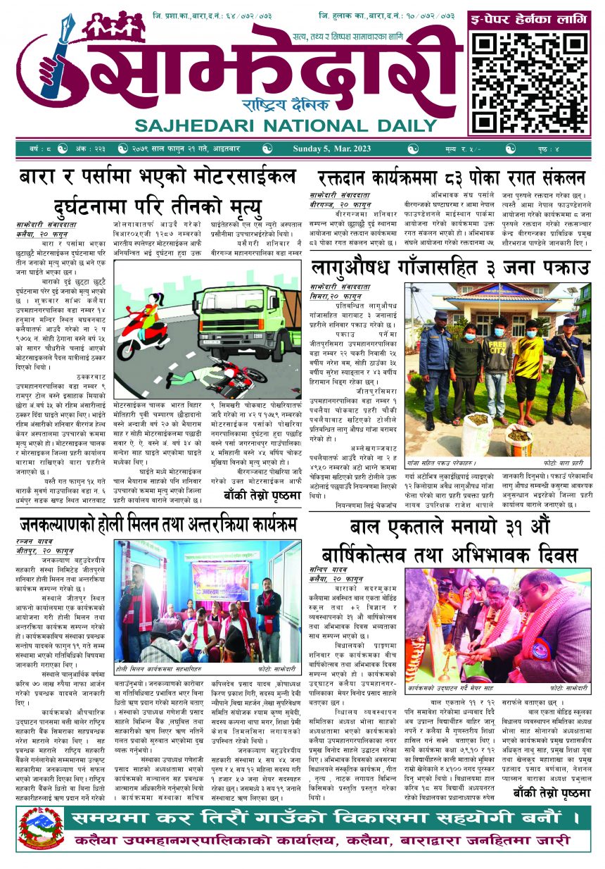 ई–पेपर २०७९ फागुन २१ गते । साझेदारी दैनिक साझेदारी दैनिक २०७९ फाल्गुन २१, गते 352 पाठक संख्या शेयर शेयर Leave a review Leave a review Leave a Review Cancel replyYour email address will not be published. Required fields are marked * Please select a rating! Your Rating Rate… Perfect Good Average Not that Bad Very Poor Your Comment *नाम * Your Email * Your website Save my name, email, and website in this browser for the next time I comment. ताजा अपडेट दुर्घटना न्यूनीकरणलाई केन्द्रमा राखेर काम गर्न डीआईजी थपलियाको निर्देशन मधेश मुख्य समाचार समाचार कलैयामा घरको ताला तोडेर करिब ५० लाख बराबरको चोरी मधेश मुख्य समाचार समाचार प्रधानमन्त्री कप क्रिकेटको उपाधि त्रिभुवन आर्मी क्लबलाई खेलकुद मधेश मुख्य समाचार समाचार लागुऔषधसहित विभिन्न स्थानबाट २४ जना पक्राउ प्रदेश समाचार समाचार सुनचाँदीको मूल्य घट्यो समाचार भन्सार छली प्रकरणः तीन जनाविरुद्ध अदालतमा मुद्दा, मुख्य अभियुक्तबाट २ करोडभन्दा बढी बिगो दाबी मधेश मुख्य समाचार समाचार जीतपुरको गौशाला जग्गा अतिक्रमण घरटहरा हटाइयो मधेश मुख्य समाचार समाचार मुख्य समाचार बारामा भूतपूर्व सैनिक पुनर्मिलन कार्यक्रम सम्पन्न मधेश समाचार पाँच पटक भन्दाबढी ट्राफिक नियम उल्लंघन गर्नेको लाइसेन्स निलम्बन प्रक्रिया सुरु मधेश मुख्य समाचार समाचार बाराका दुई नगरपालिकामा नयाँ प्रमुख प्रशासकीय अधिकृत खटाइए मधेश मुख्य समाचार समाचार पर्सामा नागरिकतासँगै राष्ट्रिय परिचयपत्र मधेश मुख्य समाचार समाचार राजश्व अनुसन्धान कार्यालय पथलैयामा आगलागी, प्रमुखको कार्यकक्ष ध्वस्त मधेश समाचार प्रदेश समाचार भाडा वृद्धि पछि सिमरा-काठमाडौं उडानमा यात्रु घटे मधेश मुख्य समाचार समाचार बारामा साढे दुई महिनामा एक करोडभन्दा बढीको अवैध सामान बरामद मधेश मुख्य समाचार समाचार सांसद साहलाई जीतपुरसिमरा-१७ का वडाबासीद्वारा ध्यानाकर्षणपत्र बुझाइयो मधेश मुख्य समाचार समाचार प्रधानमन्त्री कपको आजको खेलमा मधेस प्रदेश विजयी खेलकुद मधेश समाचार स्थानीय तहसँग मागियो विद्यालय समायोजनको विवरण प्रदेश समाचार समाचार