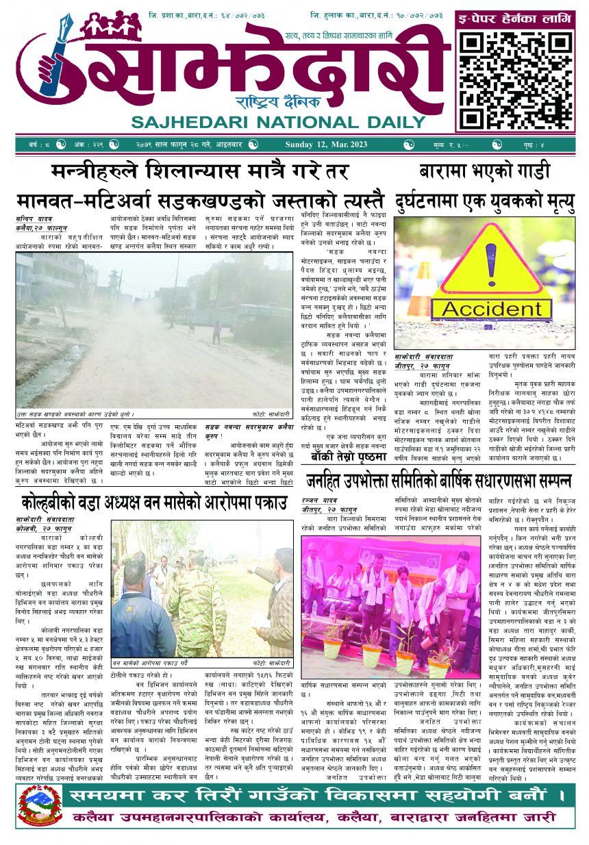 ई–पेपर २०७९ फागुन २८ गते । साझेदारी दैनिक साझेदारी दैनिक २०७९ फाल्गुन २८, गते 374 पाठक संख्या शेयर शेयर Leave a review Leave a review Leave a Review Cancel replyYour email address will not be published. Required fields are marked * Please select a rating! Your Rating Rate… Perfect Good Average Not that Bad Very Poor Your Comment *नाम * Your Email * Your website Save my name, email, and website in this browser for the next time I comment. ताजा अपडेट २०८३ वैशाख ०९ गते । साझेदारी दैनिक ई–पेपर कलैयाका व्यवसायीमाथि नगर प्रहरीको बर्बरता: पसलभित्रै छिरेर व्यवसायीलाई लछारपछार मधेश मुख्य समाचार समाचार आमामाथि कुटपिट गरी भाग्दै गरेका युवक अफिमसहित पक्राउ मधेश समाचार पर्सामा ३० हजार ट्रामाडोल ट्याब्लेटसहित भारतीय नागरिक पक्राउ मधेश समाचार तेइस लाख बालकालिकालाई भिटामिन ‘ए’ खुवाइयो समाचार स्वास्थ्य पर्सामा लागूऔषध गाँजा जस्तो पदार्थसहित चार भारतीय नागरिक पक्राउ मधेश समाचार चक्कु प्रहार गरी युवकको हत्या समाचार मुख्य समाचार बनावटी अडियो काण्ड : प्रहरी वरिष्ठ नायव निरीक्षक सागर शमसेर ज.ब.रा. निलम्बन प्रक्रियामा मधेश मुख्य समाचार समाचार १९ औं स्थापना दिवसको अवसरमा ३७ जनाद्वारा रक्तदान मधेश समाचार वीरगञ्ज भन्सारद्वारा नौ महिनामा एक खर्ब ७७ करोड राजस्व सङ्कलन मधेश समाचार व्यवसाय सञ्चालनमा पारदर्शिता र नियम पालना गर्न जीतपुरसिमरा उद्योग वाणिज्य संघको आग्रह मधेश समाचार पथलैया-चुरियामाई सडक क्षेत्रका संरचना हटाउन ३ दिनको अल्टिमेटम मधेश मुख्य समाचार समाचार प्रदेश समाचार सिमरामा ‘केआईईसी’को नयाँ शाखा सञ्चालन,विदेश अध्ययन चाहने विद्यार्थीलाई सहज मधेश मुख्य समाचार समाचार पहिलेको निर्णय फेरियो : कलैयामा अब वैशाख १६ देखि कक्षा सुरु हुने मधेश मुख्य समाचार समाचार कलैयामा वैशाख १५ गतेदेखि भर्ना अभियान, २१ गतेदेखि पठनपाठन सुरु हुने मधेश मुख्य समाचार समाचार पर्सा राष्ट्रिय निकुञ्जमा वन्यजन्तु उद्धार केन्द्र उद्घाटन मधेश समाचार कलैयामा खसी मासुको छालासहित र बिना छालाको छुट्टाछुट्टै मूल्य निर्धारण मधेश समाचार