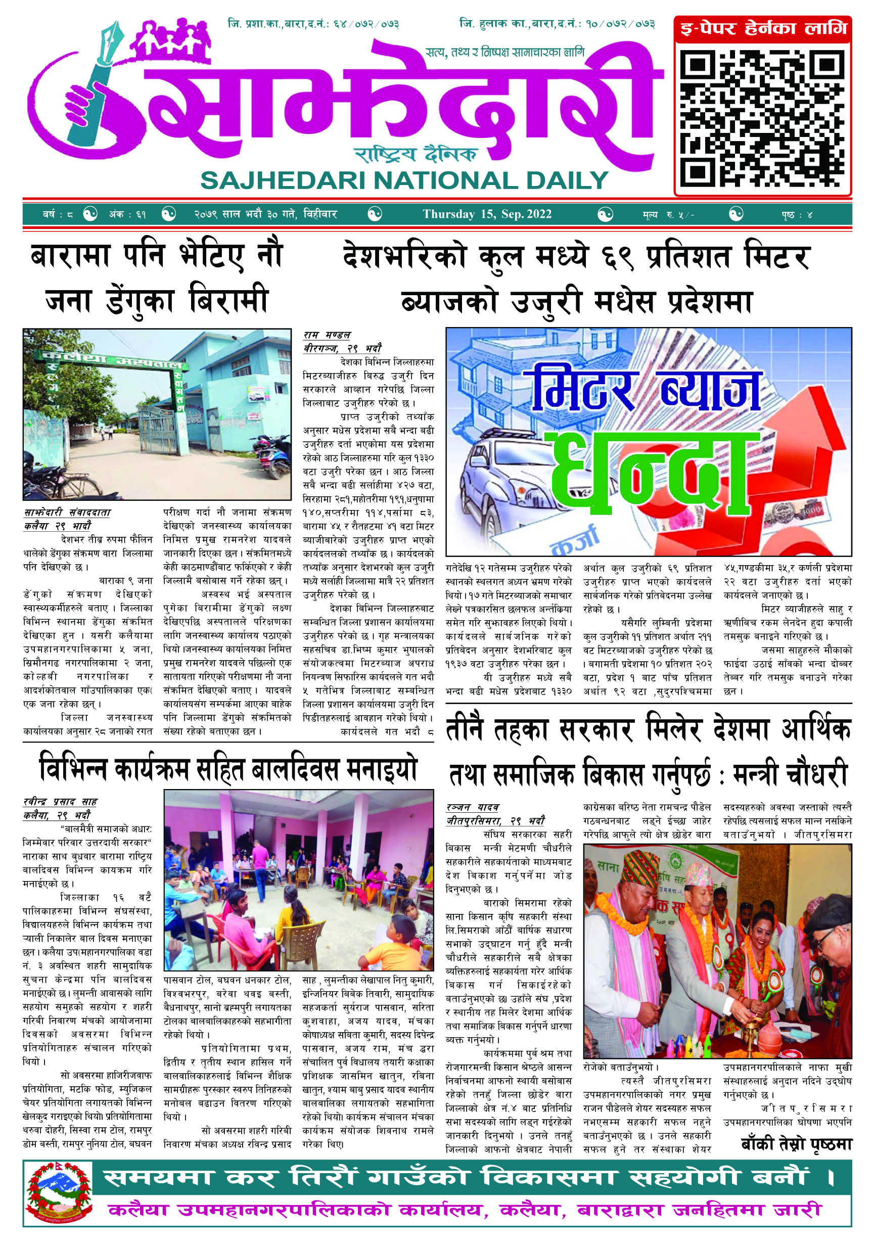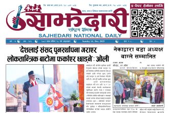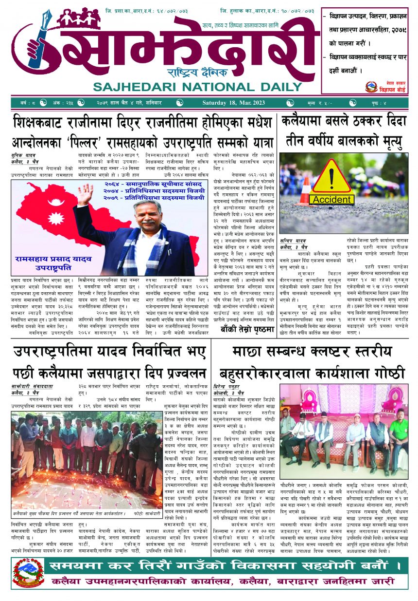 ई–पेपर २०७९ चैत्र ०४ गते । साझेदारी दैनिक साझेदारी दैनिक २०७९ चैत्र ४, गते 410 पाठक संख्या शेयर शेयर Leave a review Leave a review Leave a Review Cancel replyYour email address will not be published. Required fields are marked * Please select a rating! Your Rating Rate… Perfect Good Average Not that Bad Very Poor Your Comment *नाम * Your Email * Your website Save my name, email, and website in this browser for the next time I comment. ताजा अपडेट तेइस लाख बालकालिकालाई भिटामिन ‘ए’ खुवाइयो समाचार स्वास्थ्य पर्सामा लागूऔषध गाँजा जस्तो पदार्थसहित चार भारतीय नागरिक पक्राउ मधेश समाचार चक्कु प्रहार गरी युवकको हत्या समाचार बनावटी अडियो काण्ड : प्रहरी वरिष्ठ नायव निरीक्षक सागर शमसेर ज.ब.रा. निलम्बन प्रक्रियामा मधेश मुख्य समाचार समाचार १९ औं स्थापना दिवसको अवसरमा ३७ जनाद्वारा रक्तदान मधेश समाचार वीरगञ्ज भन्सारद्वारा नौ महिनामा एक खर्ब ७७ करोड राजस्व सङ्कलन मधेश समाचार व्यवसाय सञ्चालनमा पारदर्शिता र नियम पालना गर्न जीतपुरसिमरा उद्योग वाणिज्य संघको आग्रह मधेश समाचार मुख्य समाचार पथलैया-चुरियामाई सडक क्षेत्रका संरचना हटाउन ३ दिनको अल्टिमेटम मधेश मुख्य समाचार समाचार सिमरामा ‘केआईईसी’को नयाँ शाखा सञ्चालन,विदेश अध्ययन चाहने विद्यार्थीलाई सहज मधेश मुख्य समाचार समाचार पहिलेको निर्णय फेरियो : कलैयामा अब वैशाख १६ देखि कक्षा सुरु हुने मधेश मुख्य समाचार समाचार कलैयामा वैशाख १५ गतेदेखि भर्ना अभियान, २१ गतेदेखि पठनपाठन सुरु हुने मधेश मुख्य समाचार समाचार पर्सा राष्ट्रिय निकुञ्जमा वन्यजन्तु उद्धार केन्द्र उद्घाटन मधेश समाचार प्रदेश समाचार कलैयामा खसी मासुको छालासहित र बिना छालाको छुट्टाछुट्टै मूल्य निर्धारण मधेश समाचार सिम्रौनगढमा छाडा कुकुरको आतंक : एकै घरका ८ खसी-बाख्रा मरे मधेश मुख्य समाचार समाचार रेल्वे सेवा ७९ करोड ऋणमा मधेश समाचार सडक विस्तारले वीरगञ्जको विद्युत् अवरुद्ध मधेश मुख्य समाचार समाचार बाईपास विस्तारका लागि २४ घण्टाभित्र संरचना हटाउन वीरगञ्ज महानगरको निर्देशन मधेश मुख्य समाचार समाचार