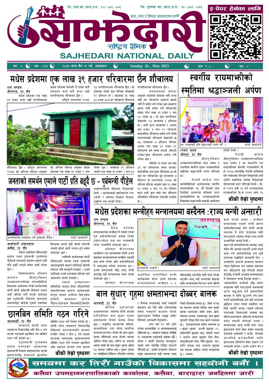 ई–पेपर २०७९ चैत्र १२ गते । साझेदारी दैनिक साझेदारी दैनिक २०७९ चैत्र ११, गते 457 पाठक संख्या शेयर शेयर Leave a review Leave a review Leave a Review Cancel replyYour email address will not be published. Required fields are marked * Please select a rating! Your Rating Rate… Perfect Good Average Not that Bad Very Poor Your Comment *नाम * Your Email * Your website Save my name, email, and website in this browser for the next time I comment. ताजा अपडेट सिमरामा भ्रष्टाचार नियन्त्रण तथा सुशासन प्रवद्र्धनबारे अन्तरक्रिया सम्पन्न मधेश समाचार मनसुन र आगलागी सचेतनामा समुदाय सशक्त बनाउँदै लुमन्ती मधेश समाचार कलैयाका नगर प्रहरी किन बन्छन् बारम्बार उग्र? भर्ना प्रक्रियामै प्रश्नचिह्न, तालिमविहीन दस्ताले बजारमा मच्चाउँछ आतंक मधेश मुख्य समाचार समाचार २०८३ वैशाख १० गते । साझेदारी दैनिक ई–पेपर महेन्द्र राजमार्ग क्षेत्रका वन अतिक्रमण हटाउन ३ दिने अल्टिमेटम मधेश मुख्य समाचार समाचार गृहमन्त्री गुरुङद्वारा राजीनामा घोषणा मधेश समाचार सुनचाँदीको मूल्यमा सामान्य गिरावट समाचार मुख्य समाचार वातावरणीय स्वीकृति बिना जथाभावी नदीजन्य पदार्थ उत्खनन नगर्न वनको निर्देशन मधेश मुख्य समाचार समाचार कलैयाका व्यवसायीमाथि नगर प्रहरीको बर्बरता: पसलभित्रै छिरेर व्यवसायीलाई लछारपछार मधेश मुख्य समाचार समाचार आमामाथि कुटपिट गरी भाग्दै गरेका युवक अफिमसहित पक्राउ मधेश समाचार पर्सामा ३० हजार ट्रामाडोल ट्याब्लेटसहित भारतीय नागरिक पक्राउ मधेश समाचार पर्सामा लागूऔषध गाँजा जस्तो पदार्थसहित चार भारतीय नागरिक पक्राउ मधेश समाचार प्रदेश समाचार बनावटी अडियो काण्ड : प्रहरी वरिष्ठ नायव निरीक्षक सागर शमसेर ज.ब.रा. निलम्बन प्रक्रियामा मधेश मुख्य समाचार समाचार १९ औं स्थापना दिवसको अवसरमा ३७ जनाद्वारा रक्तदान मधेश समाचार वीरगञ्ज भन्सारद्वारा नौ महिनामा एक खर्ब ७७ करोड राजस्व सङ्कलन मधेश समाचार व्यवसाय सञ्चालनमा पारदर्शिता र नियम पालना गर्न जीतपुरसिमरा उद्योग वाणिज्य संघको आग्रह मधेश समाचार पथलैया-चुरियामाई सडक क्षेत्रका संरचना हटाउन ३ दिनको अल्टिमेटम मधेश मुख्य समाचार समाचार