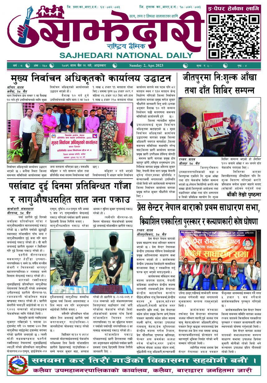 ई–पेपर २०७९ चैत्र १९ गते । साझेदारी दैनिक साझेदारी दैनिक २०७९ चैत्र २०, गते 348 पाठक संख्या शेयर शेयर Leave a review Leave a review Leave a Review Cancel replyYour email address will not be published. Required fields are marked * Please select a rating! Your Rating Rate… Perfect Good Average Not that Bad Very Poor Your Comment *नाम * Your Email * Your website Save my name, email, and website in this browser for the next time I comment. ताजा अपडेट २०८३ वैशाख ०५ गते । साझेदारी दैनिक ई–पेपर दुर्घटना न्यूनीकरणलाई केन्द्रमा राखेर काम गर्न डीआईजी थपलियाको निर्देशन मधेश मुख्य समाचार समाचार कलैयामा घरको ताला तोडेर करिब ५० लाख बराबरको चोरी मधेश मुख्य समाचार समाचार प्रधानमन्त्री कप क्रिकेटको उपाधि त्रिभुवन आर्मी क्लबलाई खेलकुद मधेश मुख्य समाचार समाचार लागुऔषधसहित विभिन्न स्थानबाट २४ जना पक्राउ प्रदेश समाचार समाचार सुनचाँदीको मूल्य घट्यो समाचार भन्सार छली प्रकरणः तीन जनाविरुद्ध अदालतमा मुद्दा, मुख्य अभियुक्तबाट २ करोडभन्दा बढी बिगो दाबी मधेश मुख्य समाचार समाचार मुख्य समाचार जीतपुरको गौशाला जग्गा अतिक्रमण घरटहरा हटाइयो मधेश मुख्य समाचार समाचार बारामा भूतपूर्व सैनिक पुनर्मिलन कार्यक्रम सम्पन्न मधेश समाचार पाँच पटक भन्दाबढी ट्राफिक नियम उल्लंघन गर्नेको लाइसेन्स निलम्बन प्रक्रिया सुरु मधेश मुख्य समाचार समाचार बाराका दुई नगरपालिकामा नयाँ प्रमुख प्रशासकीय अधिकृत खटाइए मधेश मुख्य समाचार समाचार पर्सामा नागरिकतासँगै राष्ट्रिय परिचयपत्र मधेश मुख्य समाचार समाचार प्रदेश समाचार राजश्व अनुसन्धान कार्यालय पथलैयामा आगलागी, प्रमुखको कार्यकक्ष ध्वस्त मधेश समाचार भाडा वृद्धि पछि सिमरा-काठमाडौं उडानमा यात्रु घटे मधेश मुख्य समाचार समाचार बारामा साढे दुई महिनामा एक करोडभन्दा बढीको अवैध सामान बरामद मधेश मुख्य समाचार समाचार सांसद साहलाई जीतपुरसिमरा-१७ का वडाबासीद्वारा ध्यानाकर्षणपत्र बुझाइयो मधेश मुख्य समाचार समाचार प्रधानमन्त्री कपको आजको खेलमा मधेस प्रदेश विजयी खेलकुद मधेश समाचार