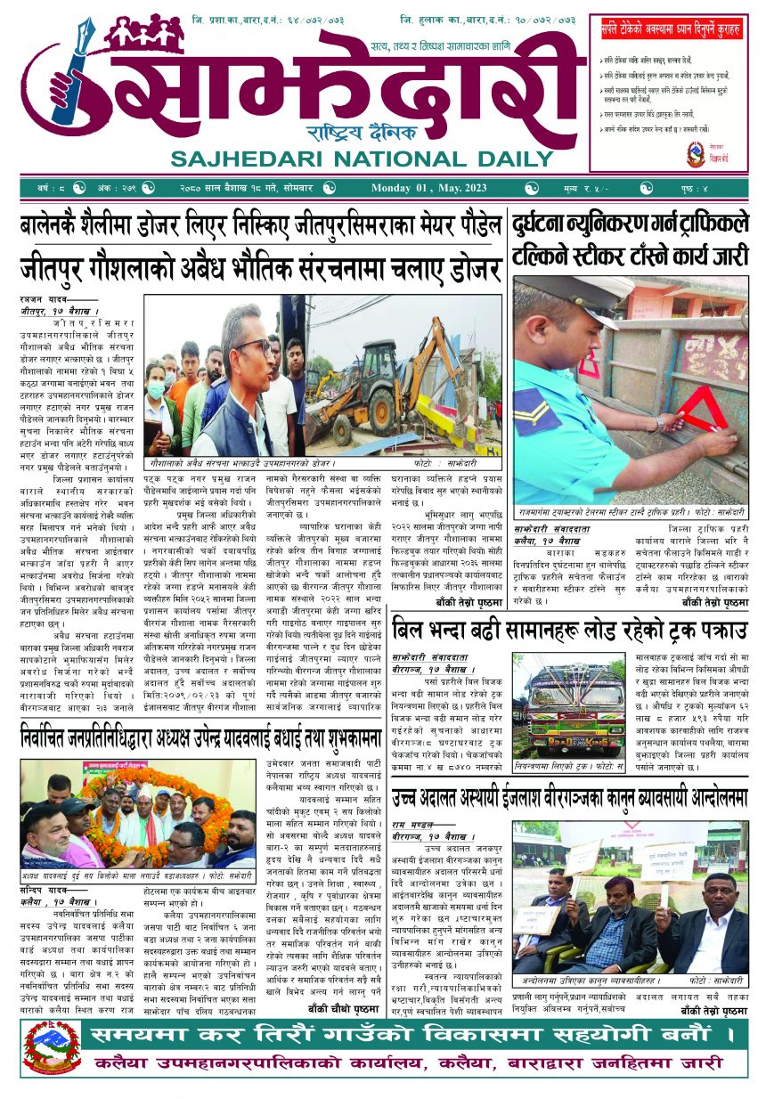 ई–पेपर २०८० बैशाख १८ गते । साझेदारी दैनिक साझेदारी दैनिक २०८० बैशाख १८, गते 358 पाठक संख्या शेयर शेयर Leave a review Leave a review Leave a Review Cancel replyYour email address will not be published. Required fields are marked * Please select a rating! Your Rating Rate… Perfect Good Average Not that Bad Very Poor Your Comment *नाम * Your Email * Your website Save my name, email, and website in this browser for the next time I comment. ताजा अपडेट चक्कु प्रहार गरी युवकको हत्या समाचार बनावटी अडियो काण्ड : प्रहरी वरिष्ठ नायव निरीक्षक सागर शमसेर ज.ब.रा. निलम्बन प्रक्रियामा मधेश मुख्य समाचार समाचार १९ औं स्थापना दिवसको अवसरमा ३७ जनाद्वारा रक्तदान मधेश समाचार वीरगञ्ज भन्सारद्वारा नौ महिनामा एक खर्ब ७७ करोड राजस्व सङ्कलन मधेश समाचार व्यवसाय सञ्चालनमा पारदर्शिता र नियम पालना गर्न जीतपुरसिमरा उद्योग वाणिज्य संघको आग्रह मधेश समाचार पथलैया-चुरियामाई सडक क्षेत्रका संरचना हटाउन ३ दिनको अल्टिमेटम मधेश मुख्य समाचार समाचार सिमरामा ‘केआईईसी’को नयाँ शाखा सञ्चालन,विदेश अध्ययन चाहने विद्यार्थीलाई सहज मधेश मुख्य समाचार समाचार मुख्य समाचार पहिलेको निर्णय फेरियो : कलैयामा अब वैशाख १६ देखि कक्षा सुरु हुने मधेश मुख्य समाचार समाचार कलैयामा वैशाख १५ गतेदेखि भर्ना अभियान, २१ गतेदेखि पठनपाठन सुरु हुने मधेश मुख्य समाचार समाचार पर्सा राष्ट्रिय निकुञ्जमा वन्यजन्तु उद्धार केन्द्र उद्घाटन मधेश समाचार कलैयामा खसी मासुको छालासहित र बिना छालाको छुट्टाछुट्टै मूल्य निर्धारण मधेश समाचार सिम्रौनगढमा छाडा कुकुरको आतंक : एकै घरका ८ खसी-बाख्रा मरे मधेश मुख्य समाचार समाचार प्रदेश समाचार रेल्वे सेवा ७९ करोड ऋणमा मधेश समाचार सडक विस्तारले वीरगञ्जको विद्युत् अवरुद्ध मधेश मुख्य समाचार समाचार बाईपास विस्तारका लागि २४ घण्टाभित्र संरचना हटाउन वीरगञ्ज महानगरको निर्देशन मधेश मुख्य समाचार समाचार वीरगञ्जमा भर्ना अभियान वैशाख ७ गतेदेखि सुरु हुने मधेश समाचार वीरगन्जमा अतिक्रमित संरचना भत्काउन सुरु मधेश मुख्य समाचार समाचार
