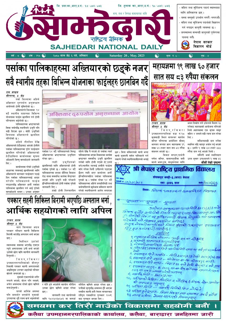 ई–पेपर २०८० जेठ ०६ गते । साझेदारी दैनिक साझेदारी दैनिक २०८० जेष्ठ ६, गते 311 पाठक संख्या शेयर शेयर Leave a review Leave a review Leave a Review Cancel replyYour email address will not be published. Required fields are marked * Please select a rating! Your Rating Rate… Perfect Good Average Not that Bad Very Poor Your Comment *नाम * Your Email * Your website Save my name, email, and website in this browser for the next time I comment. ताजा अपडेट रास्वपाको महामन्त्रीमा शाह मनोनित राजनीति समाचार पहिलेको निर्णय फेरियो : कलैयामा अब वैशाख १६ देखि कक्षा सुरु हुने मधेश मुख्य समाचार समाचार कलैयामा वैशाख १५ गतेदेखि भर्ना अभियान, २१ गतेदेखि पठनपाठन सुरु हुने मधेश मुख्य समाचार समाचार पेट्रोलियम पदार्थमा गरिएको मूल्य वृद्धि फिर्ता लिन अध्यक्ष घिसिङको माग समाचार पर्सा राष्ट्रिय निकुञ्जमा वन्यजन्तु उद्धार केन्द्र उद्घाटन मधेश समाचार कलैयामा खसी मासुको छालासहित र बिना छालाको छुट्टाछुट्टै मूल्य निर्धारण मधेश समाचार सिम्रौनगढमा छाडा कुकुरको आतंक : एकै घरका ८ खसी-बाख्रा मरे मधेश मुख्य समाचार समाचार मुख्य समाचार रेल्वे सेवा ७९ करोड ऋणमा मधेश समाचार सडक विस्तारले वीरगञ्जको विद्युत् अवरुद्ध मधेश मुख्य समाचार समाचार बाईपास विस्तारका लागि २४ घण्टाभित्र संरचना हटाउन वीरगञ्ज महानगरको निर्देशन मधेश मुख्य समाचार समाचार वीरगञ्जमा भर्ना अभियान वैशाख ७ गतेदेखि सुरु हुने मधेश समाचार वीरगन्जमा अतिक्रमित संरचना भत्काउन सुरु मधेश मुख्य समाचार समाचार प्रदेश समाचार जीतपुरसिमराको बिद्यालयमा पठनपाठन वैशाख १४ गते देखि सुरु हुने मधेश मुख्य समाचार समाचार करैयामाई -६ सिहोर्वामा नि:शुल्क स्वास्थ्य शिविर सम्पन्न मधेश समाचार स्वास्थ्य बारामा खेतबाट घर फर्किँदै गर्दा चट्याङ लागेर एक जनाको मृत्यु मधेश मुख्य समाचार समाचार बृन्दावनमा ६ सुकुम्बासी परिवार विस्थापित मधेश समाचार सुनसरीमा काँचो केरासहित चार जना पक्राउ मधेश मुख्य समाचार समाचार