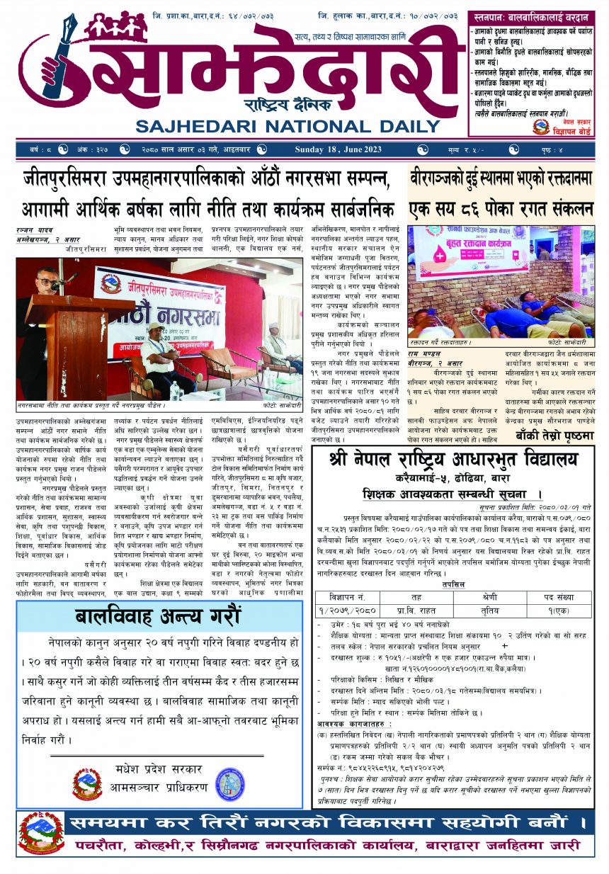 ई–पेपर २०८० असार ०३ गते । साझेदारी दैनिक साझेदारी दैनिक २०८० असार २, गते 313 पाठक संख्या शेयर शेयर Leave a review Leave a review Leave a Review Cancel replyYour email address will not be published. Required fields are marked * Please select a rating! Your Rating Rate… Perfect Good Average Not that Bad Very Poor Your Comment *नाम * Your Email * Your website Save my name, email, and website in this browser for the next time I comment. ताजा अपडेट डाबर नेपाल अगाडि दुर्घटना : श्रीमान्को मृत्यु, श्रीमती गम्भीर मधेश समाचार यातायात कार्यालय कलैयाबाट भोलिदेखि स्मार्ट लाइसेन्स वितरण सुरु हुने मधेश मुख्य समाचार समाचार घरबारविहीनको व्यवस्थापनको जिम्मा सरकारले लिन्छः सभापति लामिछाने समाचार हावाहुरीका बेला चुँडिएका तार नछुन नेपाल विद्युत प्राधिकरण कलैया वितरण केन्द्रको चेतावनी मधेश समाचार माधवनारायण नगरपालिकाको अत्याधुनिक प्रशासनिक भवन उद्घाटन मधेश समाचार वीरगन्ज हुँदै भित्रियो २६ अर्ब १३ करोडको सवारीसाधन र पार्टपुर्जा मधेश समाचार जिल्लाका दुई सय बढीले पाए जग्गाधनी पुर्जा समाचार मुख्य समाचार जितपुरमा प्रहरी इन्चार्जमाथि आर्थिक आतंकको आरोप ,व्यापारीदेखि ट्रान्सपोर्ट व्यवसायीसम्म त्रसित, मासिक लाखौं असुली हुने दाबी मधेश मुख्य समाचार समाचार प्रिन्ट भएको लाइसेन्स अझै नआएको भन्दै यातायात कार्यालय कलैयाको सूचना मधेश मुख्य समाचार समाचार रौतहटमा पूर्वाधार र पर्यटन कार्यालयविरुद्ध जसपाको कडा घेराबन्दी, चरम भ्रष्टाचार र कमिसनखोरीको आरोप मधेश समाचार वीरगञ्ज नाका हुँदै तीन अर्बको विद्युतीय सवारीसाधन आयात मधेश मुख्य समाचार समाचार जीतपुरसिमरा–६ मा वडा कार्यालय भवन उद्घाटन मधेश समाचार प्रदेश समाचार राष्ट्रिय स्वतन्त्र पार्टीको कलैया संयोजकमा उमाशंकर साह रौनियार चयन मधेश राजनीति समाचार परवानीपुरमा कृषि संकलन केन्द्र सञ्चालन, किसानलाई बजार सहज मधेश मुख्य समाचार समाचार सशस्त्र प्रहरी बल नम्बर ११ गण रौतहटद्वारा १९ औँ स्थापना दिवस भव्य रूपमा सम्पन्न मधेश समाचार हावाहुरी र असिनाले निलकण्ठवामा ३ घरमा क्षति मधेश मुख्य समाचार समाचार रौतहटमा गुणस्तरहीन निर्माण कार्य भएको भन्दै स्थानीयद्वारा विरोध ,काका ठेकेदार भतिजा ईन्जिनियर मधेश मुख्य समाचार समाचार