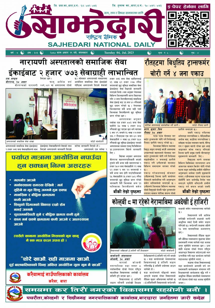 ई–पेपर २०८० असार १९ गते । साझेदारी दैनिक साझेदारी दैनिक २०८० असार १९, गते 297 पाठक संख्या शेयर शेयर Leave a review Leave a review Leave a Review Cancel replyYour email address will not be published. Required fields are marked * Please select a rating! Your Rating Rate… Perfect Good Average Not that Bad Very Poor Your Comment *नाम * Your Email * Your website Save my name, email, and website in this browser for the next time I comment. ताजा अपडेट दुर्घटना न्यूनीकरणलाई केन्द्रमा राखेर काम गर्न डीआईजी थपलियाको निर्देशन मधेश मुख्य समाचार समाचार कलैयामा घरको ताला तोडेर करिब ५० लाख बराबरको चोरी मधेश मुख्य समाचार समाचार प्रधानमन्त्री कप क्रिकेटको उपाधि त्रिभुवन आर्मी क्लबलाई खेलकुद मधेश मुख्य समाचार समाचार लागुऔषधसहित विभिन्न स्थानबाट २४ जना पक्राउ प्रदेश समाचार समाचार सुनचाँदीको मूल्य घट्यो समाचार भन्सार छली प्रकरणः तीन जनाविरुद्ध अदालतमा मुद्दा, मुख्य अभियुक्तबाट २ करोडभन्दा बढी बिगो दाबी मधेश मुख्य समाचार समाचार जीतपुरको गौशाला जग्गा अतिक्रमण घरटहरा हटाइयो मधेश मुख्य समाचार समाचार मुख्य समाचार बारामा भूतपूर्व सैनिक पुनर्मिलन कार्यक्रम सम्पन्न मधेश समाचार पाँच पटक भन्दाबढी ट्राफिक नियम उल्लंघन गर्नेको लाइसेन्स निलम्बन प्रक्रिया सुरु मधेश मुख्य समाचार समाचार बाराका दुई नगरपालिकामा नयाँ प्रमुख प्रशासकीय अधिकृत खटाइए मधेश मुख्य समाचार समाचार पर्सामा नागरिकतासँगै राष्ट्रिय परिचयपत्र मधेश मुख्य समाचार समाचार राजश्व अनुसन्धान कार्यालय पथलैयामा आगलागी, प्रमुखको कार्यकक्ष ध्वस्त मधेश समाचार प्रदेश समाचार भाडा वृद्धि पछि सिमरा-काठमाडौं उडानमा यात्रु घटे मधेश मुख्य समाचार समाचार बारामा साढे दुई महिनामा एक करोडभन्दा बढीको अवैध सामान बरामद मधेश मुख्य समाचार समाचार सांसद साहलाई जीतपुरसिमरा-१७ का वडाबासीद्वारा ध्यानाकर्षणपत्र बुझाइयो मधेश मुख्य समाचार समाचार प्रधानमन्त्री कपको आजको खेलमा मधेस प्रदेश विजयी खेलकुद मधेश समाचार स्थानीय तहसँग मागियो विद्यालय समायोजनको विवरण प्रदेश समाचार समाचार