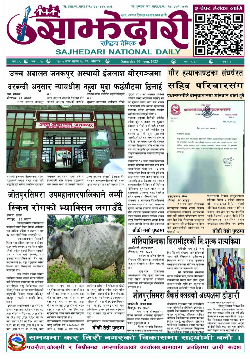 ई–पेपर २०८० साउन २० गते । साझेदारी दैनिक साझेदारी दैनिक २०८० श्रावण २१, गते 509 पाठक संख्या शेयर शेयर Leave a review Leave a review Leave a Review Cancel replyYour email address will not be published. Required fields are marked * Please select a rating! Your Rating Rate… Perfect Good Average Not that Bad Very Poor Your Comment *नाम * Your Email * Your website Save my name, email, and website in this browser for the next time I comment. ताजा अपडेट रौतहटमा गुणस्तरहीन निर्माण कार्य भएको भन्दै स्थानीयद्वारा विरोध ,काका ठेकेदार भतिजा ईन्जिनियर मधेश मुख्य समाचार समाचार गण्डक नहर किनारका अतिक्रमित संरचना हटाउन थालियो मधेश समाचार कलैया : बसपार्कबाटै सवारी चलाउने निर्णय अझै कार्यान्वयन भएन मधेश मुख्य समाचार समाचार सुनचाँदीको मुल्य आज बढ्यो समाचार मनोहरा सुकुमवासी बस्तीमा घरटहरा भत्काउन सुरु समाचार खुला नाकाबाट सोझै वीरगन्ज भित्रिन्छ भारतीय तरकारी मधेश समाचार मधुवनमा काठसहित एक जना पक्राउ मधेश समाचार मुख्य समाचार सेज क्षेत्रको अतिक्रमण हटाउने प्रक्रिया तीव्र हुँदै,५ सय बिघा जमिन फिर्ता लिन सरकारको दबाब मधेश मुख्य समाचार समाचार कलवारको नेतृत्वमा शान्ति युवा मञ्चको नयाँ समिति गठन मधेश समाचार अत्याधिक गर्मीलाई मध्यनजर गर्दै कलैयामा निःशुल्क पानी र शरबत वितरण मधेश समाचार कलैयामा अब सबै रुटका सवारी बसपार्कबाट मात्र सञ्चालन हुने मधेश मुख्य समाचार समाचार बिजुली, पानी र विवाह रकम भुक्तानीको माग गर्दै मौलापुर नगरपालिकाविरुद्ध आन्दोलन घोषणा मधेश समाचार प्रदेश समाचार थापाथलीको सुकुमबासी बस्ती खाली गरियो बागमती समाचार वीरगञ्जबाट पेट्रोलियम आयात, साठी अर्ब अठतीस करोड राजस्व सङ्कलन मधेश समाचार पथलैयामा ओभरलोड सवारीमाथि एक्सनः दुई दिनमै ६ गाडी कारवाहीमा मधेश मुख्य समाचार समाचार सुकुम्वासी मोर्चाका कार्यवाहक अध्यक्ष परियार पक्राउ बागमती समाचार भूमिहीनलाई ३० दिनभित्र विवरण पेश गर्न वीरगञ्ज महानगरको सूचना मधेश समाचार