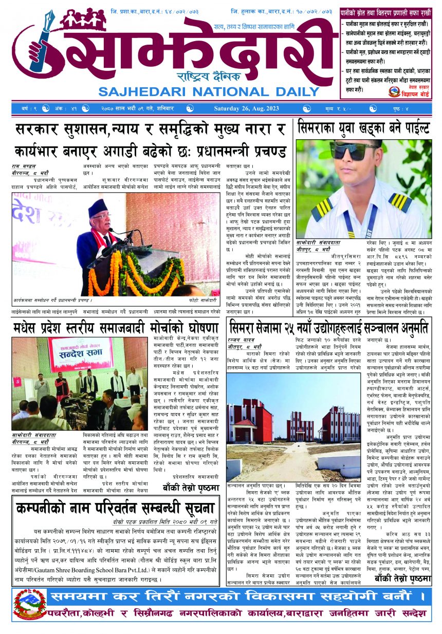 ई–पेपर २०८० भदौ ०९ गते । साझेदारी दैनिक साझेदारी दैनिक २०८० भाद्र ९, गते 1k पाठक संख्या शेयर शेयर Leave a review Leave a review Leave a Review Cancel replyYour email address will not be published. Required fields are marked * Please select a rating! Your Rating Rate… Perfect Good Average Not that Bad Very Poor Your Comment *नाम * Your Email * Your website Save my name, email, and website in this browser for the next time I comment. ताजा अपडेट वीरगञ्ज भन्सारद्वारा नौ महिनामा एक खर्ब ७७ करोड राजस्व सङ्कलन मधेश समाचार व्यवसाय सञ्चालनमा पारदर्शिता र नियम पालना गर्न जीतपुरसिमरा उद्योग वाणिज्य संघको आग्रह मधेश समाचार पथलैया-चुरियामाई सडक क्षेत्रका संरचना हटाउन ३ दिनको अल्टिमेटम मधेश मुख्य समाचार समाचार सिमरामा ‘केआईईसी’को नयाँ शाखा सञ्चालन,विदेश अध्ययन चाहने विद्यार्थीलाई सहज मधेश मुख्य समाचार समाचार २०८३ वैशाख ०८ गते । साझेदारी दैनिक ई–पेपर रास्वपाको महामन्त्रीमा शाह मनोनित राजनीति समाचार पहिलेको निर्णय फेरियो : कलैयामा अब वैशाख १६ देखि कक्षा सुरु हुने मधेश मुख्य समाचार समाचार मुख्य समाचार कलैयामा वैशाख १५ गतेदेखि भर्ना अभियान, २१ गतेदेखि पठनपाठन सुरु हुने मधेश मुख्य समाचार समाचार पर्सा राष्ट्रिय निकुञ्जमा वन्यजन्तु उद्धार केन्द्र उद्घाटन मधेश समाचार कलैयामा खसी मासुको छालासहित र बिना छालाको छुट्टाछुट्टै मूल्य निर्धारण मधेश समाचार सिम्रौनगढमा छाडा कुकुरको आतंक : एकै घरका ८ खसी-बाख्रा मरे मधेश मुख्य समाचार समाचार रेल्वे सेवा ७९ करोड ऋणमा मधेश समाचार प्रदेश समाचार सडक विस्तारले वीरगञ्जको विद्युत् अवरुद्ध मधेश मुख्य समाचार समाचार बाईपास विस्तारका लागि २४ घण्टाभित्र संरचना हटाउन वीरगञ्ज महानगरको निर्देशन मधेश मुख्य समाचार समाचार वीरगञ्जमा भर्ना अभियान वैशाख ७ गतेदेखि सुरु हुने मधेश समाचार वीरगन्जमा अतिक्रमित संरचना भत्काउन सुरु मधेश मुख्य समाचार समाचार जीतपुरसिमराको बिद्यालयमा पठनपाठन वैशाख १४ गते देखि सुरु हुने मधेश मुख्य समाचार समाचार