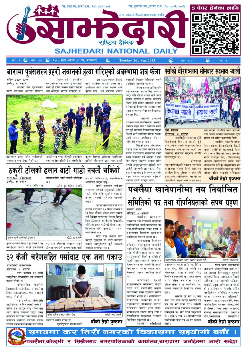 ई–पेपर २०८० असोज ०९ गते । साझेदारी दैनिक साझेदारी दैनिक २०८० आश्विन ९, गते 359 पाठक संख्या शेयर शेयर Leave a review Leave a review Leave a Review Cancel replyYour email address will not be published. Required fields are marked * Please select a rating! Your Rating Rate… Perfect Good Average Not that Bad Very Poor Your Comment *नाम * Your Email * Your website Save my name, email, and website in this browser for the next time I comment. ताजा अपडेट करैयामाई -६ सिहोर्वामा नि:शुल्क स्वास्थ्य शिविर सम्पन्न मधेश समाचार स्वास्थ्य बारामा खेतबाट घर फर्किँदै गर्दा चट्याङ लागेर एक जनाको मृत्यु मधेश मुख्य समाचार समाचार बृन्दावनमा ६ सुकुम्बासी परिवार विस्थापित मधेश समाचार सुनसरीमा काँचो केरासहित चार जना पक्राउ मधेश मुख्य समाचार समाचार २०८३ वैशाख ०५ गते । साझेदारी दैनिक ई–पेपर दुर्घटना न्यूनीकरणलाई केन्द्रमा राखेर काम गर्न डीआईजी थपलियाको निर्देशन मधेश मुख्य समाचार समाचार कलैयामा घरको ताला तोडेर करिब ५० लाख बराबरको चोरी मधेश मुख्य समाचार समाचार मुख्य समाचार प्रधानमन्त्री कप क्रिकेटको उपाधि त्रिभुवन आर्मी क्लबलाई खेलकुद मधेश मुख्य समाचार समाचार भन्सार छली प्रकरणः तीन जनाविरुद्ध अदालतमा मुद्दा, मुख्य अभियुक्तबाट २ करोडभन्दा बढी बिगो दाबी मधेश मुख्य समाचार समाचार जीतपुरको गौशाला जग्गा अतिक्रमण घरटहरा हटाइयो मधेश मुख्य समाचार समाचार बारामा भूतपूर्व सैनिक पुनर्मिलन कार्यक्रम सम्पन्न मधेश समाचार पाँच पटक भन्दाबढी ट्राफिक नियम उल्लंघन गर्नेको लाइसेन्स निलम्बन प्रक्रिया सुरु मधेश मुख्य समाचार समाचार प्रदेश समाचार लागुऔषधसहित विभिन्न स्थानबाट २४ जना पक्राउ प्रदेश समाचार समाचार बाराका दुई नगरपालिकामा नयाँ प्रमुख प्रशासकीय अधिकृत खटाइए मधेश मुख्य समाचार समाचार पर्सामा नागरिकतासँगै राष्ट्रिय परिचयपत्र मधेश मुख्य समाचार समाचार राजश्व अनुसन्धान कार्यालय पथलैयामा आगलागी, प्रमुखको कार्यकक्ष ध्वस्त मधेश समाचार भाडा वृद्धि पछि सिमरा-काठमाडौं उडानमा यात्रु घटे मधेश मुख्य समाचार समाचार