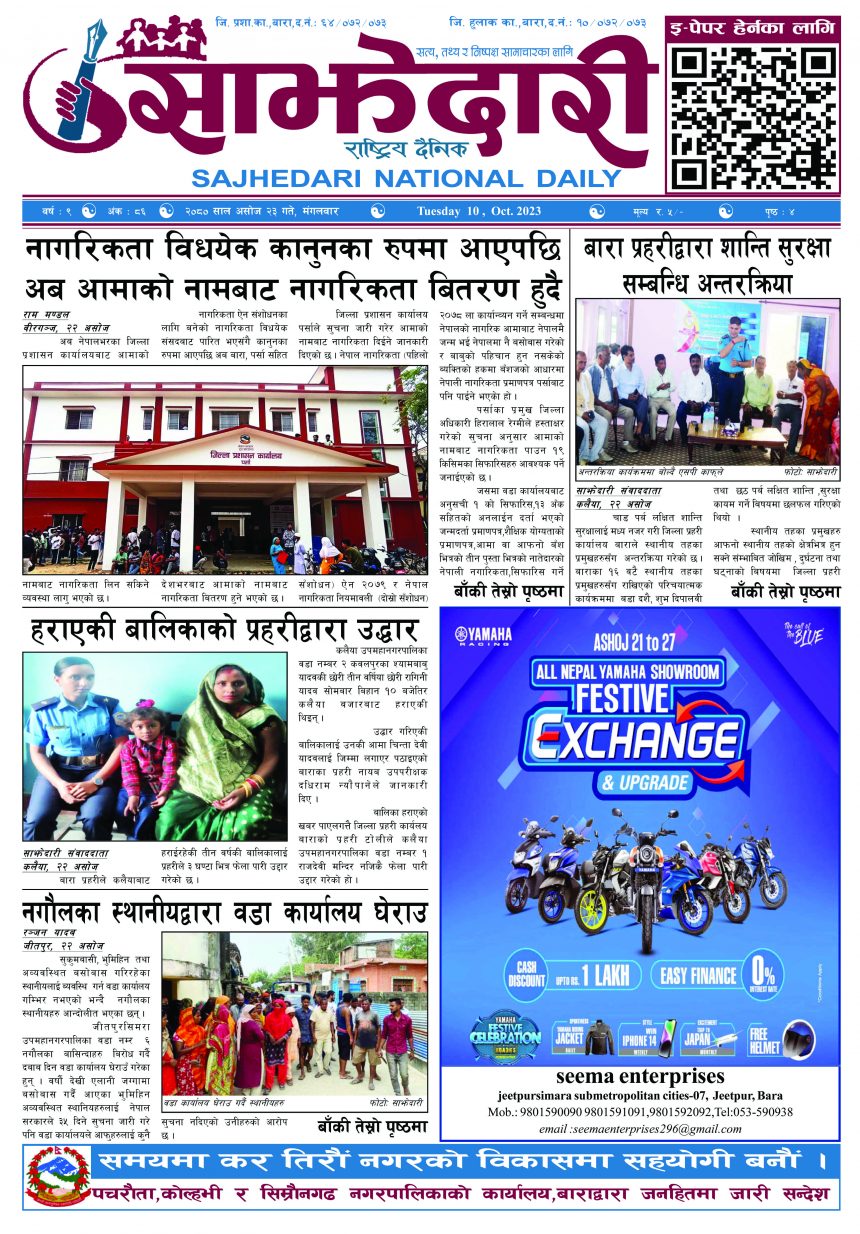 ई–पेपर २०८० असोज २३ गते । साझेदारी दैनिक साझेदारी दैनिक २०८० आश्विन २३, गते 325 पाठक संख्या शेयर शेयर Leave a review Leave a review Leave a Review Cancel replyYour email address will not be published. Required fields are marked * Please select a rating! Your Rating Rate… Perfect Good Average Not that Bad Very Poor Your Comment *नाम * Your Email * Your website Save my name, email, and website in this browser for the next time I comment. ताजा अपडेट तेइस लाख बालकालिकालाई भिटामिन ‘ए’ खुवाइयो समाचार स्वास्थ्य पर्सामा लागूऔषध गाँजा जस्तो पदार्थसहित चार भारतीय नागरिक पक्राउ मधेश समाचार चक्कु प्रहार गरी युवकको हत्या समाचार बनावटी अडियो काण्ड : प्रहरी वरिष्ठ नायव निरीक्षक सागर शमसेर ज.ब.रा. निलम्बन प्रक्रियामा मधेश मुख्य समाचार समाचार १९ औं स्थापना दिवसको अवसरमा ३७ जनाद्वारा रक्तदान मधेश समाचार वीरगञ्ज भन्सारद्वारा नौ महिनामा एक खर्ब ७७ करोड राजस्व सङ्कलन मधेश समाचार व्यवसाय सञ्चालनमा पारदर्शिता र नियम पालना गर्न जीतपुरसिमरा उद्योग वाणिज्य संघको आग्रह मधेश समाचार मुख्य समाचार पथलैया-चुरियामाई सडक क्षेत्रका संरचना हटाउन ३ दिनको अल्टिमेटम मधेश मुख्य समाचार समाचार सिमरामा ‘केआईईसी’को नयाँ शाखा सञ्चालन,विदेश अध्ययन चाहने विद्यार्थीलाई सहज मधेश मुख्य समाचार समाचार पहिलेको निर्णय फेरियो : कलैयामा अब वैशाख १६ देखि कक्षा सुरु हुने मधेश मुख्य समाचार समाचार कलैयामा वैशाख १५ गतेदेखि भर्ना अभियान, २१ गतेदेखि पठनपाठन सुरु हुने मधेश मुख्य समाचार समाचार पर्सा राष्ट्रिय निकुञ्जमा वन्यजन्तु उद्धार केन्द्र उद्घाटन मधेश समाचार प्रदेश समाचार कलैयामा खसी मासुको छालासहित र बिना छालाको छुट्टाछुट्टै मूल्य निर्धारण मधेश समाचार सिम्रौनगढमा छाडा कुकुरको आतंक : एकै घरका ८ खसी-बाख्रा मरे मधेश मुख्य समाचार समाचार रेल्वे सेवा ७९ करोड ऋणमा मधेश समाचार सडक विस्तारले वीरगञ्जको विद्युत् अवरुद्ध मधेश मुख्य समाचार समाचार बाईपास विस्तारका लागि २४ घण्टाभित्र संरचना हटाउन वीरगञ्ज महानगरको निर्देशन मधेश मुख्य समाचार समाचार