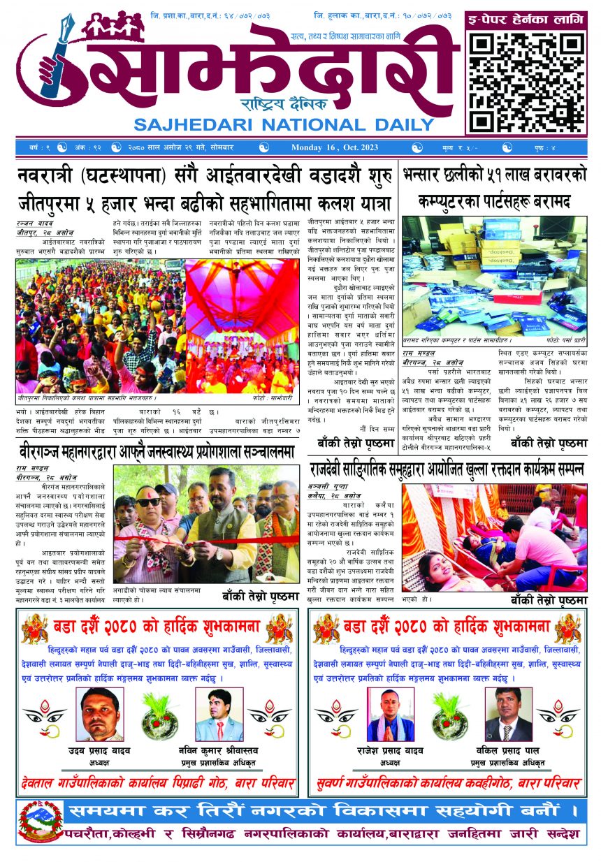 ई–पेपर २०८० असोज २९ गते । साझेदारी दैनिक साझेदारी दैनिक २०८० आश्विन २९, गते 233 पाठक संख्या शेयर शेयर Leave a review Leave a review Leave a Review Cancel replyYour email address will not be published. Required fields are marked * Please select a rating! Your Rating Rate… Perfect Good Average Not that Bad Very Poor Your Comment *नाम * Your Email * Your website Save my name, email, and website in this browser for the next time I comment. ताजा अपडेट सुनसरीमा काँचो केरासहित चार जना पक्राउ मधेश मुख्य समाचार समाचार २०८३ वैशाख ०५ गते । साझेदारी दैनिक ई–पेपर दुर्घटना न्यूनीकरणलाई केन्द्रमा राखेर काम गर्न डीआईजी थपलियाको निर्देशन मधेश मुख्य समाचार समाचार कलैयामा घरको ताला तोडेर करिब ५० लाख बराबरको चोरी मधेश मुख्य समाचार समाचार प्रधानमन्त्री कप क्रिकेटको उपाधि त्रिभुवन आर्मी क्लबलाई खेलकुद मधेश मुख्य समाचार समाचार लागुऔषधसहित विभिन्न स्थानबाट २४ जना पक्राउ प्रदेश समाचार समाचार सुनचाँदीको मूल्य घट्यो समाचार मुख्य समाचार भन्सार छली प्रकरणः तीन जनाविरुद्ध अदालतमा मुद्दा, मुख्य अभियुक्तबाट २ करोडभन्दा बढी बिगो दाबी मधेश मुख्य समाचार समाचार जीतपुरको गौशाला जग्गा अतिक्रमण घरटहरा हटाइयो मधेश मुख्य समाचार समाचार बारामा भूतपूर्व सैनिक पुनर्मिलन कार्यक्रम सम्पन्न मधेश समाचार पाँच पटक भन्दाबढी ट्राफिक नियम उल्लंघन गर्नेको लाइसेन्स निलम्बन प्रक्रिया सुरु मधेश मुख्य समाचार समाचार बाराका दुई नगरपालिकामा नयाँ प्रमुख प्रशासकीय अधिकृत खटाइए मधेश मुख्य समाचार समाचार प्रदेश समाचार पर्सामा नागरिकतासँगै राष्ट्रिय परिचयपत्र मधेश मुख्य समाचार समाचार राजश्व अनुसन्धान कार्यालय पथलैयामा आगलागी, प्रमुखको कार्यकक्ष ध्वस्त मधेश समाचार भाडा वृद्धि पछि सिमरा-काठमाडौं उडानमा यात्रु घटे मधेश मुख्य समाचार समाचार बारामा साढे दुई महिनामा एक करोडभन्दा बढीको अवैध सामान बरामद मधेश मुख्य समाचार समाचार सांसद साहलाई जीतपुरसिमरा-१७ का वडाबासीद्वारा ध्यानाकर्षणपत्र बुझाइयो मधेश मुख्य समाचार समाचार