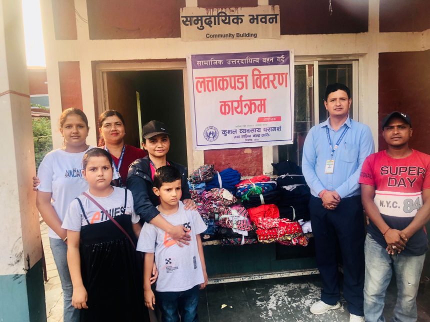 कुशलका कार्यकारी निर्देशक सरोज कोइराला सहितको समुहले ९३ जना बालबालिका,११ जना सुत्केरी महिला र अन्य ९७ जनालाई ३ सय ७८ थान कपडा वितरण गरेको छ ।
