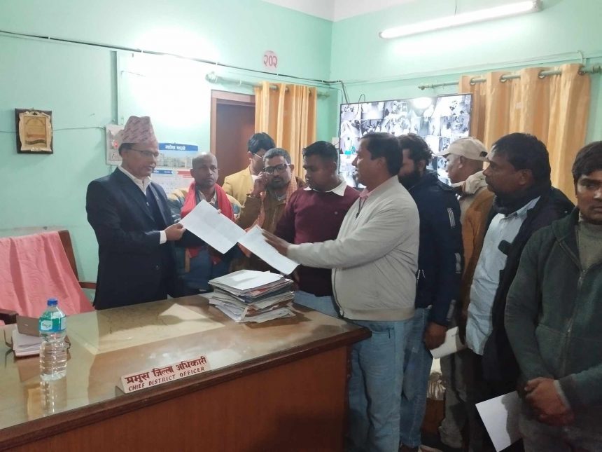 सिम्रौनगढ नगरपालिकाका पूर्व नगरप्रमुख बिजयशंकर यादवको नेतृत्वमा रहेको टोलीले बाराका प्रमुख जिल्ला अधिकारी नवराज सापकोटालाई ज्ञापनपत्र बुझाएको हो ।