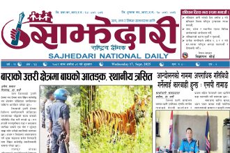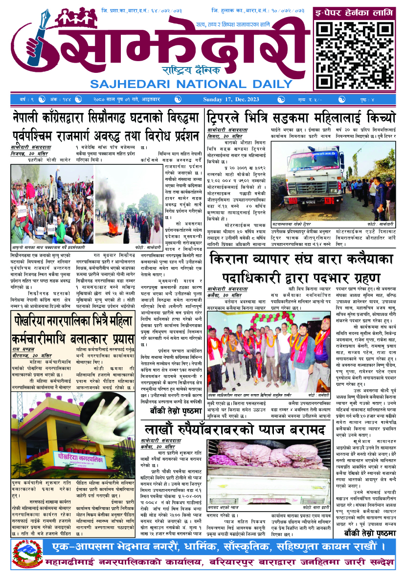 ई–पेपर २०८० पुस ०१ गते । साझेदारी दैनिक साझेदारी दैनिक २०८० पुष १, गते 301 पाठक संख्या शेयर शेयर Leave a review Leave a review Leave a Review Cancel replyYour email address will not be published. Required fields are marked * Please select a rating! Your Rating Rate… Perfect Good Average Not that Bad Very Poor Your Comment *नाम * Your Email * Your website Save my name, email, and website in this browser for the next time I comment. ताजा अपडेट कलैयाका व्यवसायीमाथि नगर प्रहरीको बर्बरता: पसलभित्रै छिरेर व्यवसायीलाई लछारपछार मधेश मुख्य समाचार समाचार आमामाथि कुटपिट गरी भाग्दै गरेका युवक अफिमसहित पक्राउ मधेश समाचार पर्सामा ३० हजार ट्रामाडोल ट्याब्लेटसहित भारतीय नागरिक पक्राउ मधेश समाचार तेइस लाख बालकालिकालाई भिटामिन ‘ए’ खुवाइयो समाचार स्वास्थ्य पर्सामा लागूऔषध गाँजा जस्तो पदार्थसहित चार भारतीय नागरिक पक्राउ मधेश समाचार चक्कु प्रहार गरी युवकको हत्या समाचार बनावटी अडियो काण्ड : प्रहरी वरिष्ठ नायव निरीक्षक सागर शमसेर ज.ब.रा. निलम्बन प्रक्रियामा मधेश मुख्य समाचार समाचार मुख्य समाचार १९ औं स्थापना दिवसको अवसरमा ३७ जनाद्वारा रक्तदान मधेश समाचार वीरगञ्ज भन्सारद्वारा नौ महिनामा एक खर्ब ७७ करोड राजस्व सङ्कलन मधेश समाचार व्यवसाय सञ्चालनमा पारदर्शिता र नियम पालना गर्न जीतपुरसिमरा उद्योग वाणिज्य संघको आग्रह मधेश समाचार पथलैया-चुरियामाई सडक क्षेत्रका संरचना हटाउन ३ दिनको अल्टिमेटम मधेश मुख्य समाचार समाचार सिमरामा ‘केआईईसी’को नयाँ शाखा सञ्चालन,विदेश अध्ययन चाहने विद्यार्थीलाई सहज मधेश मुख्य समाचार समाचार प्रदेश समाचार पहिलेको निर्णय फेरियो : कलैयामा अब वैशाख १६ देखि कक्षा सुरु हुने मधेश मुख्य समाचार समाचार कलैयामा वैशाख १५ गतेदेखि भर्ना अभियान, २१ गतेदेखि पठनपाठन सुरु हुने मधेश मुख्य समाचार समाचार पर्सा राष्ट्रिय निकुञ्जमा वन्यजन्तु उद्धार केन्द्र उद्घाटन मधेश समाचार कलैयामा खसी मासुको छालासहित र बिना छालाको छुट्टाछुट्टै मूल्य निर्धारण मधेश समाचार सिम्रौनगढमा छाडा कुकुरको आतंक : एकै घरका ८ खसी-बाख्रा मरे मधेश मुख्य समाचार समाचार