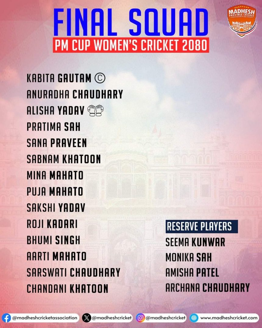 प्रधानमन्त्री कप राष्ट्रिय महिला क्रिकेट प्रतियोगिताको लागि मधेस प्रदेशको लागि टिम घोषणा गरिएकोछ ।