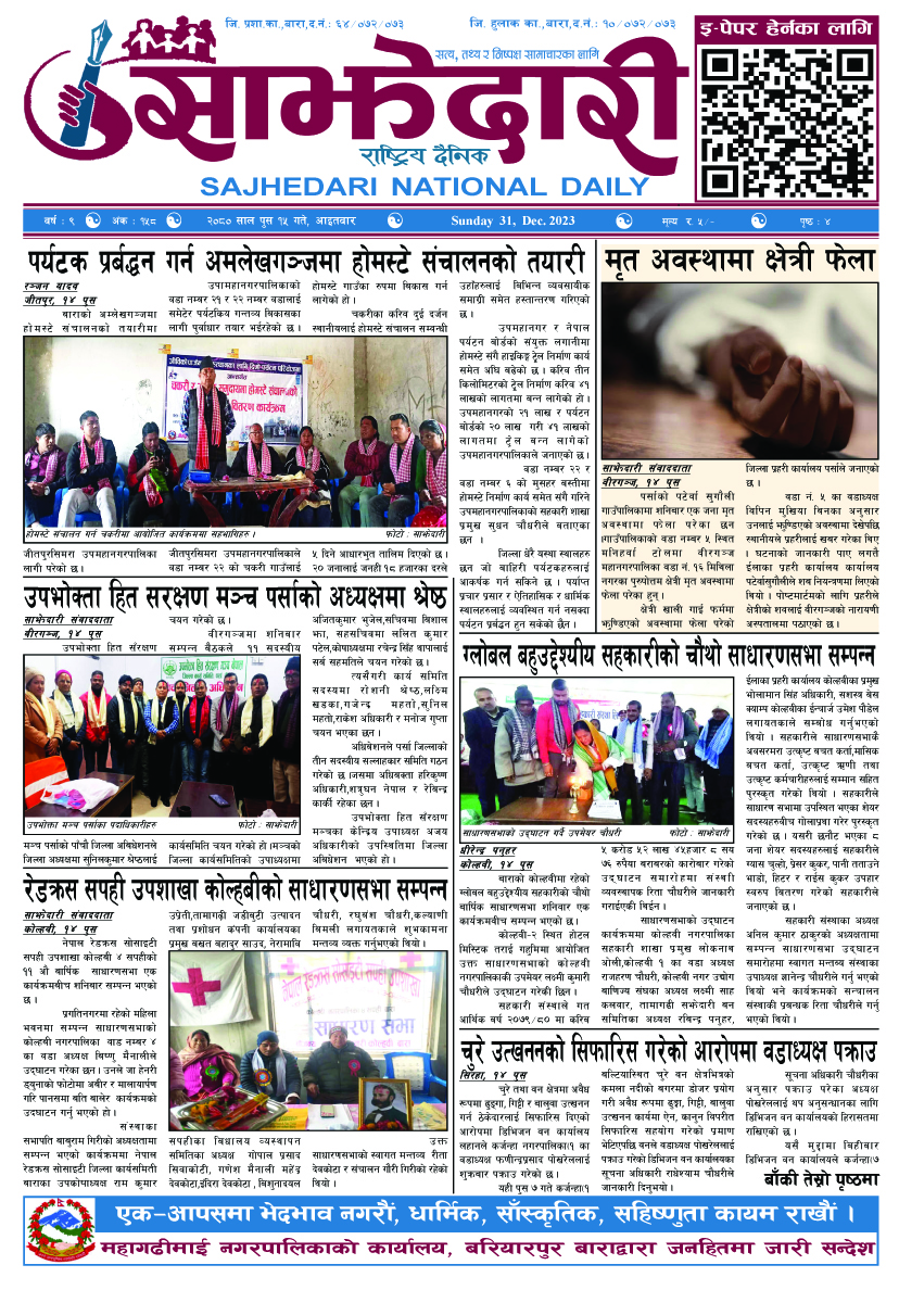 ई–पेपर २०८० पुस १५ गते । साझेदारी दैनिक साझेदारी दैनिक २०८० पुष १६, गते 353 पाठक संख्या शेयर शेयर Leave a review Leave a review Leave a Review Cancel replyYour email address will not be published. Required fields are marked * Please select a rating! Your Rating Rate… Perfect Good Average Not that Bad Very Poor Your Comment *नाम * Your Email * Your website Save my name, email, and website in this browser for the next time I comment. ताजा अपडेट सुनचाँदीको मूल्यमा केही गिरावट समाचार नहर अतिक्रमण हटाउन चार सय घरटहरा हटाइँदै मधेश मुख्य समाचार समाचार २०८३ वैशाख १७ गते । साझेदारी दैनिक ई–पेपर डाबर नेपाल अगाडि दुर्घटना : श्रीमान्को मृत्यु, श्रीमती गम्भीर मधेश समाचार यातायात कार्यालय कलैयाबाट भोलिदेखि स्मार्ट लाइसेन्स वितरण सुरु हुने मधेश मुख्य समाचार समाचार घरबारविहीनको व्यवस्थापनको जिम्मा सरकारले लिन्छः सभापति लामिछाने समाचार हावाहुरीका बेला चुँडिएका तार नछुन नेपाल विद्युत प्राधिकरण कलैया वितरण केन्द्रको चेतावनी मधेश समाचार मुख्य समाचार माधवनारायण नगरपालिकाको अत्याधुनिक प्रशासनिक भवन उद्घाटन मधेश समाचार वीरगन्ज हुँदै भित्रियो २६ अर्ब १३ करोडको सवारीसाधन र पार्टपुर्जा मधेश समाचार जितपुरमा प्रहरी इन्चार्जमाथि आर्थिक आतंकको आरोप ,व्यापारीदेखि ट्रान्सपोर्ट व्यवसायीसम्म त्रसित, मासिक लाखौं असुली हुने दाबी मधेश मुख्य समाचार समाचार प्रिन्ट भएको लाइसेन्स अझै नआएको भन्दै यातायात कार्यालय कलैयाको सूचना मधेश मुख्य समाचार समाचार रौतहटमा पूर्वाधार र पर्यटन कार्यालयविरुद्ध जसपाको कडा घेराबन्दी, चरम भ्रष्टाचार र कमिसनखोरीको आरोप मधेश समाचार प्रदेश समाचार वीरगञ्ज नाका हुँदै तीन अर्बको विद्युतीय सवारीसाधन आयात मधेश मुख्य समाचार समाचार जीतपुरसिमरा–६ मा वडा कार्यालय भवन उद्घाटन मधेश समाचार राष्ट्रिय स्वतन्त्र पार्टीको कलैया संयोजकमा उमाशंकर साह रौनियार चयन मधेश राजनीति समाचार परवानीपुरमा कृषि संकलन केन्द्र सञ्चालन, किसानलाई बजार सहज मधेश मुख्य समाचार समाचार सशस्त्र प्रहरी बल नम्बर ११ गण रौतहटद्वारा १९ औँ स्थापना दिवस भव्य रूपमा सम्पन्न मधेश समाचार