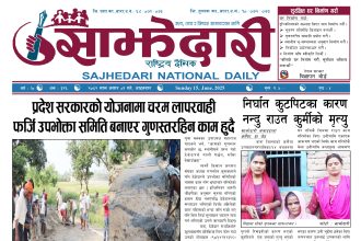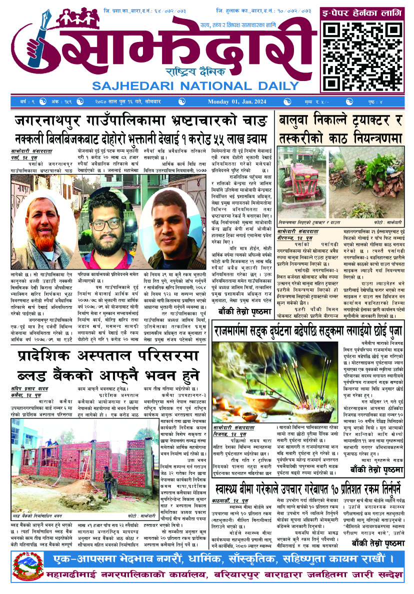 ई–पेपर २०८० पुस १६ गते । साझेदारी दैनिक साझेदारी दैनिक २०८० पुष १६, गते 530 पाठक संख्या शेयर शेयर Leave a review Leave a review Leave a Review Cancel replyYour email address will not be published. Required fields are marked * Please select a rating! Your Rating Rate… Perfect Good Average Not that Bad Very Poor Your Comment *नाम * Your Email * Your website Save my name, email, and website in this browser for the next time I comment. ताजा अपडेट पेट्रोलियम पदार्थमा गरिएको मूल्य वृद्धि फिर्ता लिन अध्यक्ष घिसिङको माग समाचार पर्सा राष्ट्रिय निकुञ्जमा वन्यजन्तु उद्धार केन्द्र उद्घाटन मधेश समाचार कलैयामा खसी मासुको छालासहित र बिना छालाको छुट्टाछुट्टै मूल्य निर्धारण मधेश समाचार सिम्रौनगढमा छाडा कुकुरको आतंक : एकै घरका ८ खसी-बाख्रा मरे मधेश मुख्य समाचार समाचार २०८३ वैशाख ०७ गते । साझेदारी दैनिक ई–पेपर रेल्वे सेवा ७९ करोड ऋणमा मधेश समाचार सडक विस्तारले वीरगञ्जको विद्युत् अवरुद्ध मधेश मुख्य समाचार समाचार मुख्य समाचार बाईपास विस्तारका लागि २४ घण्टाभित्र संरचना हटाउन वीरगञ्ज महानगरको निर्देशन मधेश मुख्य समाचार समाचार वीरगञ्जमा भर्ना अभियान वैशाख ७ गतेदेखि सुरु हुने मधेश समाचार वीरगन्जमा अतिक्रमित संरचना भत्काउन सुरु मधेश मुख्य समाचार समाचार जीतपुरसिमराको बिद्यालयमा पठनपाठन वैशाख १४ गते देखि सुरु हुने मधेश मुख्य समाचार समाचार करैयामाई -६ सिहोर्वामा नि:शुल्क स्वास्थ्य शिविर सम्पन्न मधेश समाचार स्वास्थ्य प्रदेश समाचार बारामा खेतबाट घर फर्किँदै गर्दा चट्याङ लागेर एक जनाको मृत्यु मधेश मुख्य समाचार समाचार बृन्दावनमा ६ सुकुम्बासी परिवार विस्थापित मधेश समाचार सुनसरीमा काँचो केरासहित चार जना पक्राउ मधेश मुख्य समाचार समाचार दुर्घटना न्यूनीकरणलाई केन्द्रमा राखेर काम गर्न डीआईजी थपलियाको निर्देशन मधेश मुख्य समाचार समाचार कलैयामा घरको ताला तोडेर करिब ५० लाख बराबरको चोरी मधेश मुख्य समाचार समाचार