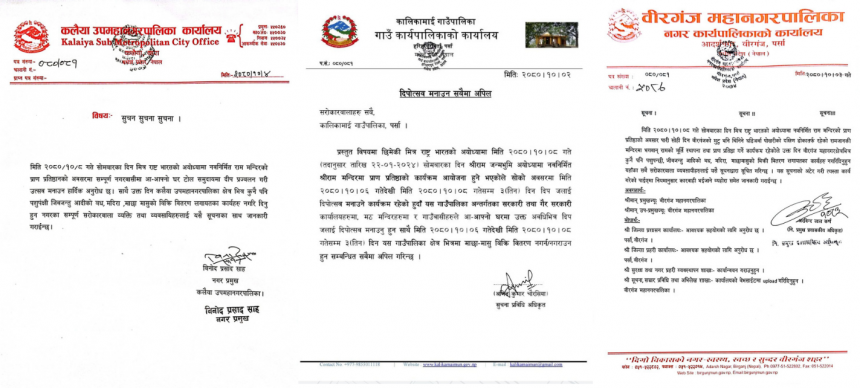 यसैविच बाराको कलैया उपमहानगरपालिकाका नगर प्रमुख विनोद साहले गत माघ ४ गते नै सूचना जारी गर्दै २२ जनवरी अर्थात माघ ८ गते अयोध्यामा हुनलागेको राम मन्दिरको प्राण प्रतिष्ठानको दिन उपमहानगरपालिका क्षेत्रभित्र दिप प्रज्वलन गरि उत्सव मनाउन जनाएको छ । भने सोही दिन माछामासु, मदिरा लगायतका बस्तु बिक्री बितरण नगर्न÷गराउन हुन आग्रह गर्नु भएको थियो ।
