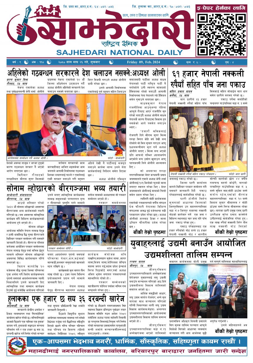 ई–पेपर २०८० माघ २६ गते । साझेदारी दैनिक साझेदारी दैनिक २०८० माघ २६, गते 398 पाठक संख्या शेयर शेयर Leave a review Leave a review Leave a Review Cancel replyYour email address will not be published. Required fields are marked * Please select a rating! Your Rating Rate… Perfect Good Average Not that Bad Very Poor Your Comment *नाम * Your Email * Your website Save my name, email, and website in this browser for the next time I comment. ताजा अपडेट तेइस लाख बालकालिकालाई भिटामिन ‘ए’ खुवाइयो समाचार स्वास्थ्य पर्सामा लागूऔषध गाँजा जस्तो पदार्थसहित चार भारतीय नागरिक पक्राउ मधेश समाचार चक्कु प्रहार गरी युवकको हत्या समाचार बनावटी अडियो काण्ड : प्रहरी वरिष्ठ नायव निरीक्षक सागर शमसेर ज.ब.रा. निलम्बन प्रक्रियामा मधेश मुख्य समाचार समाचार १९ औं स्थापना दिवसको अवसरमा ३७ जनाद्वारा रक्तदान मधेश समाचार वीरगञ्ज भन्सारद्वारा नौ महिनामा एक खर्ब ७७ करोड राजस्व सङ्कलन मधेश समाचार व्यवसाय सञ्चालनमा पारदर्शिता र नियम पालना गर्न जीतपुरसिमरा उद्योग वाणिज्य संघको आग्रह मधेश समाचार मुख्य समाचार पथलैया-चुरियामाई सडक क्षेत्रका संरचना हटाउन ३ दिनको अल्टिमेटम मधेश मुख्य समाचार समाचार सिमरामा ‘केआईईसी’को नयाँ शाखा सञ्चालन,विदेश अध्ययन चाहने विद्यार्थीलाई सहज मधेश मुख्य समाचार समाचार पहिलेको निर्णय फेरियो : कलैयामा अब वैशाख १६ देखि कक्षा सुरु हुने मधेश मुख्य समाचार समाचार कलैयामा वैशाख १५ गतेदेखि भर्ना अभियान, २१ गतेदेखि पठनपाठन सुरु हुने मधेश मुख्य समाचार समाचार पर्सा राष्ट्रिय निकुञ्जमा वन्यजन्तु उद्धार केन्द्र उद्घाटन मधेश समाचार प्रदेश समाचार कलैयामा खसी मासुको छालासहित र बिना छालाको छुट्टाछुट्टै मूल्य निर्धारण मधेश समाचार सिम्रौनगढमा छाडा कुकुरको आतंक : एकै घरका ८ खसी-बाख्रा मरे मधेश मुख्य समाचार समाचार रेल्वे सेवा ७९ करोड ऋणमा मधेश समाचार सडक विस्तारले वीरगञ्जको विद्युत् अवरुद्ध मधेश मुख्य समाचार समाचार बाईपास विस्तारका लागि २४ घण्टाभित्र संरचना हटाउन वीरगञ्ज महानगरको निर्देशन मधेश मुख्य समाचार समाचार