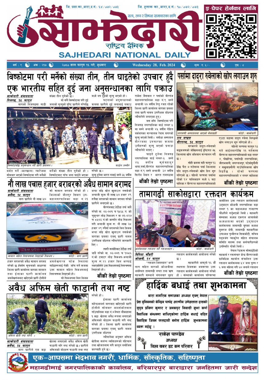 ई–पेपर २०८० फागुन १६ गते । साझेदारी दैनिक साझेदारी दैनिक २०८० फाल्गुन १६, गते 294 पाठक संख्या शेयर २०८० फागुन १६ गते । साझेदारी दैनिक शेयर Leave a review Leave a review Leave a Review Cancel replyYour email address will not be published. Required fields are marked * Please select a rating! Your Rating Rate… Perfect Good Average Not that Bad Very Poor Your Comment *नाम * Your Email * Your website Save my name, email, and website in this browser for the next time I comment. ताजा अपडेट कलैयामा वैशाख १५ गतेदेखि भर्ना अभियान, २१ गतेदेखि पठनपाठन सुरु हुने मधेश मुख्य समाचार समाचार पेट्रोलियम पदार्थमा गरिएको मूल्य वृद्धि फिर्ता लिन अध्यक्ष घिसिङको माग समाचार पर्सा राष्ट्रिय निकुञ्जमा वन्यजन्तु उद्धार केन्द्र उद्घाटन मधेश समाचार कलैयामा खसी मासुको छालासहित र बिना छालाको छुट्टाछुट्टै मूल्य निर्धारण मधेश समाचार सिम्रौनगढमा छाडा कुकुरको आतंक : एकै घरका ८ खसी-बाख्रा मरे मधेश मुख्य समाचार समाचार २०८३ वैशाख ०७ गते । साझेदारी दैनिक ई–पेपर रेल्वे सेवा ७९ करोड ऋणमा मधेश समाचार मुख्य समाचार सडक विस्तारले वीरगञ्जको विद्युत् अवरुद्ध मधेश मुख्य समाचार समाचार बाईपास विस्तारका लागि २४ घण्टाभित्र संरचना हटाउन वीरगञ्ज महानगरको निर्देशन मधेश मुख्य समाचार समाचार वीरगञ्जमा भर्ना अभियान वैशाख ७ गतेदेखि सुरु हुने मधेश समाचार वीरगन्जमा अतिक्रमित संरचना भत्काउन सुरु मधेश मुख्य समाचार समाचार जीतपुरसिमराको बिद्यालयमा पठनपाठन वैशाख १४ गते देखि सुरु हुने मधेश मुख्य समाचार समाचार प्रदेश समाचार करैयामाई -६ सिहोर्वामा नि:शुल्क स्वास्थ्य शिविर सम्पन्न मधेश समाचार स्वास्थ्य बारामा खेतबाट घर फर्किँदै गर्दा चट्याङ लागेर एक जनाको मृत्यु मधेश मुख्य समाचार समाचार बृन्दावनमा ६ सुकुम्बासी परिवार विस्थापित मधेश समाचार सुनसरीमा काँचो केरासहित चार जना पक्राउ मधेश मुख्य समाचार समाचार दुर्घटना न्यूनीकरणलाई केन्द्रमा राखेर काम गर्न डीआईजी थपलियाको निर्देशन मधेश मुख्य समाचार समाचार