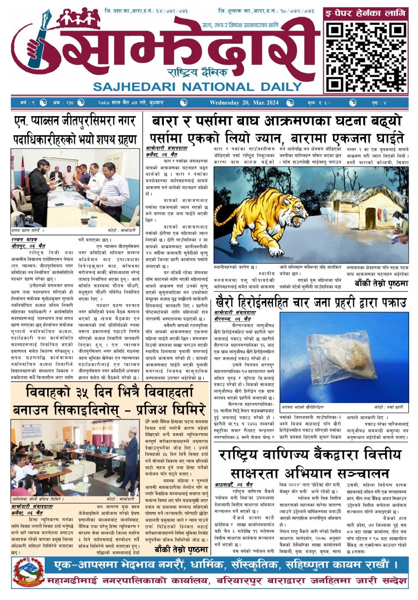 ई–पेपर २०८० चैत ०७ गते । साझेदारी दैनिक साझेदारी दैनिक २०८० चैत्र ७, गते 260 पाठक संख्या शेयर २०८० चैत ०७ गते । साझेदारी दैनिक शेयर Leave a review Leave a review Leave a Review Cancel replyYour email address will not be published. Required fields are marked * Please select a rating! Your Rating Rate… Perfect Good Average Not that Bad Very Poor Your Comment *नाम * Your Email * Your website Save my name, email, and website in this browser for the next time I comment. ताजा अपडेट २०८३ वैशाख ०५ गते । साझेदारी दैनिक ई–पेपर दुर्घटना न्यूनीकरणलाई केन्द्रमा राखेर काम गर्न डीआईजी थपलियाको निर्देशन मधेश मुख्य समाचार समाचार कलैयामा घरको ताला तोडेर करिब ५० लाख बराबरको चोरी मधेश मुख्य समाचार समाचार प्रधानमन्त्री कप क्रिकेटको उपाधि त्रिभुवन आर्मी क्लबलाई खेलकुद मधेश मुख्य समाचार समाचार लागुऔषधसहित विभिन्न स्थानबाट २४ जना पक्राउ प्रदेश समाचार समाचार सुनचाँदीको मूल्य घट्यो समाचार भन्सार छली प्रकरणः तीन जनाविरुद्ध अदालतमा मुद्दा, मुख्य अभियुक्तबाट २ करोडभन्दा बढी बिगो दाबी मधेश मुख्य समाचार समाचार मुख्य समाचार जीतपुरको गौशाला जग्गा अतिक्रमण घरटहरा हटाइयो मधेश मुख्य समाचार समाचार बारामा भूतपूर्व सैनिक पुनर्मिलन कार्यक्रम सम्पन्न मधेश समाचार पाँच पटक भन्दाबढी ट्राफिक नियम उल्लंघन गर्नेको लाइसेन्स निलम्बन प्रक्रिया सुरु मधेश मुख्य समाचार समाचार बाराका दुई नगरपालिकामा नयाँ प्रमुख प्रशासकीय अधिकृत खटाइए मधेश मुख्य समाचार समाचार पर्सामा नागरिकतासँगै राष्ट्रिय परिचयपत्र मधेश मुख्य समाचार समाचार प्रदेश समाचार राजश्व अनुसन्धान कार्यालय पथलैयामा आगलागी, प्रमुखको कार्यकक्ष ध्वस्त मधेश समाचार भाडा वृद्धि पछि सिमरा-काठमाडौं उडानमा यात्रु घटे मधेश मुख्य समाचार समाचार बारामा साढे दुई महिनामा एक करोडभन्दा बढीको अवैध सामान बरामद मधेश मुख्य समाचार समाचार सांसद साहलाई जीतपुरसिमरा-१७ का वडाबासीद्वारा ध्यानाकर्षणपत्र बुझाइयो मधेश मुख्य समाचार समाचार प्रधानमन्त्री कपको आजको खेलमा मधेस प्रदेश विजयी खेलकुद मधेश समाचार