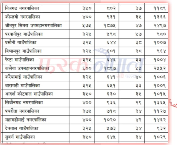 महागढीमाईले १४ करोड ६२ लाख, कोल्हवी नगरपालिकाले १३ करोड ६६ लाख, सिम्रौनगढ नगरपालिकाले १३ करोड ६५ लाख, निजगढ नगरपालिकाले ११ करोड ८९ लाख, पचरौता नगरपालिकाले ११ करोड २७ लाख प्राप्त गरेको छ ।
