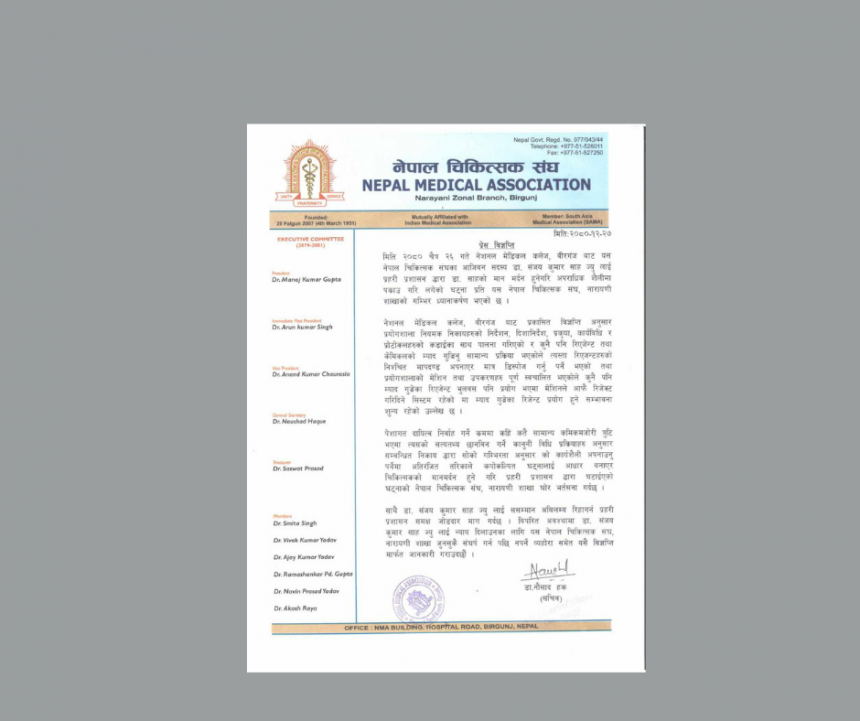 नेशनल मेडिकल कलेजका ल्याबका डा.साहलाई रिहा गर्न नेपाल चिकित्सक संघले माँग गरेको छ । नेपाल चिकित्सक संघ नारायणी शाखाले प्रेस बिज्ञप्ति जारी गरी यस्तो माग गरेको हो ।