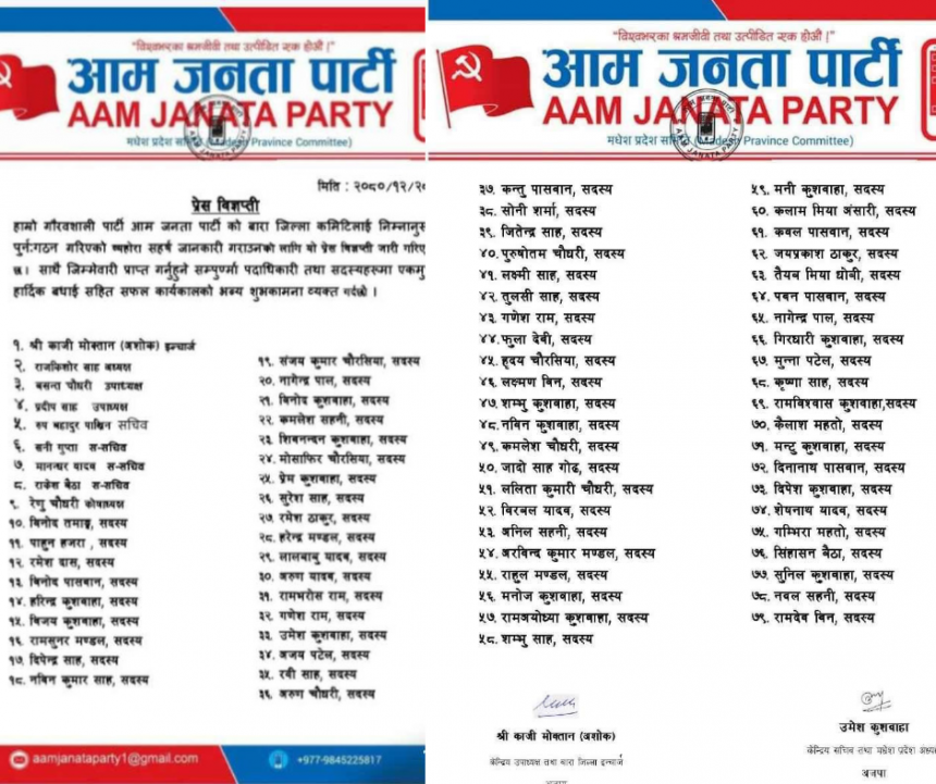 आम जनता पार्टीको जिल्ला कार्य समिति बारा पुर्नगठन भएको छ ।
