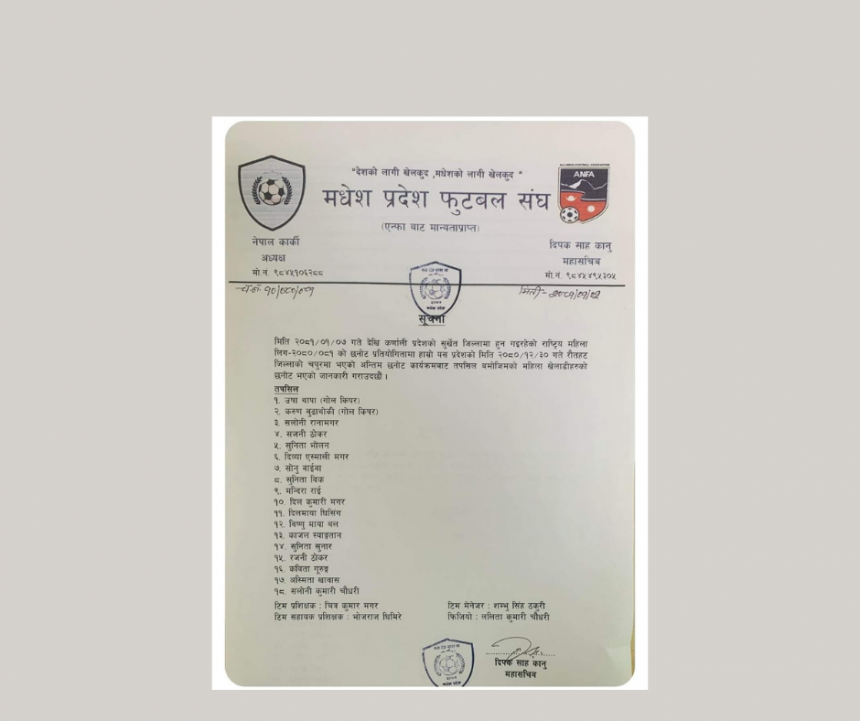 राष्ट्रिय महिला लिग फुटबल छनोटको लागि मधेस प्रदेशको टिम घोषणा भएको छ ।