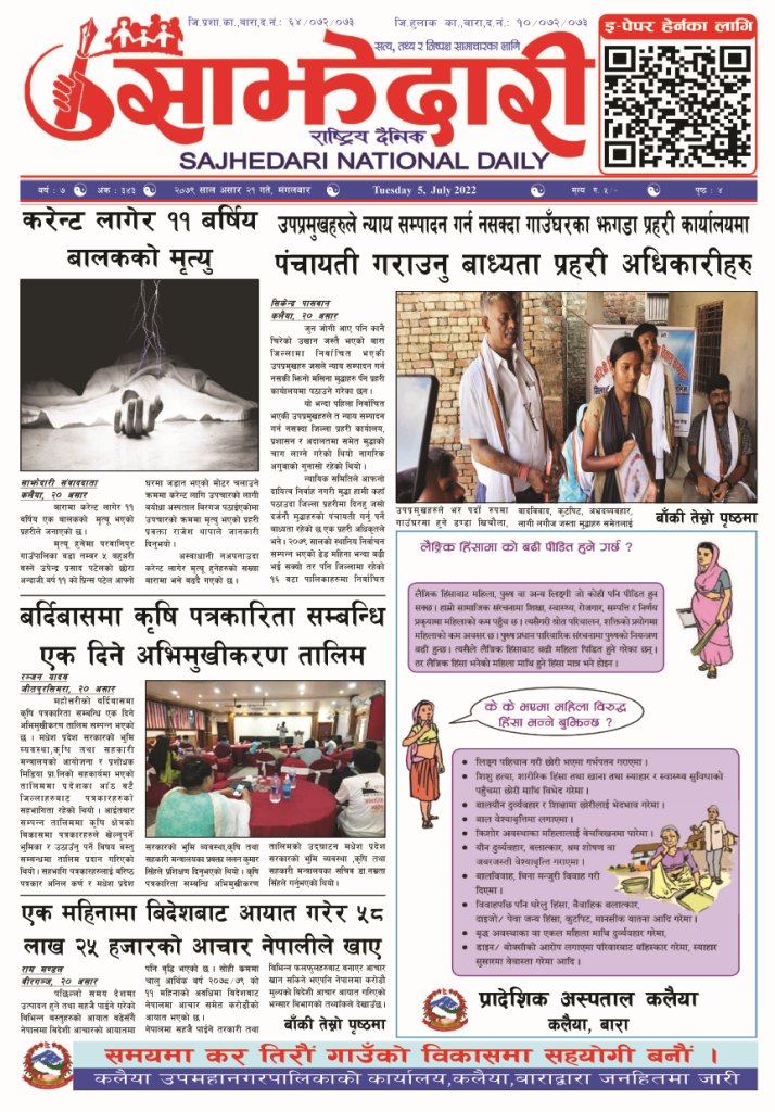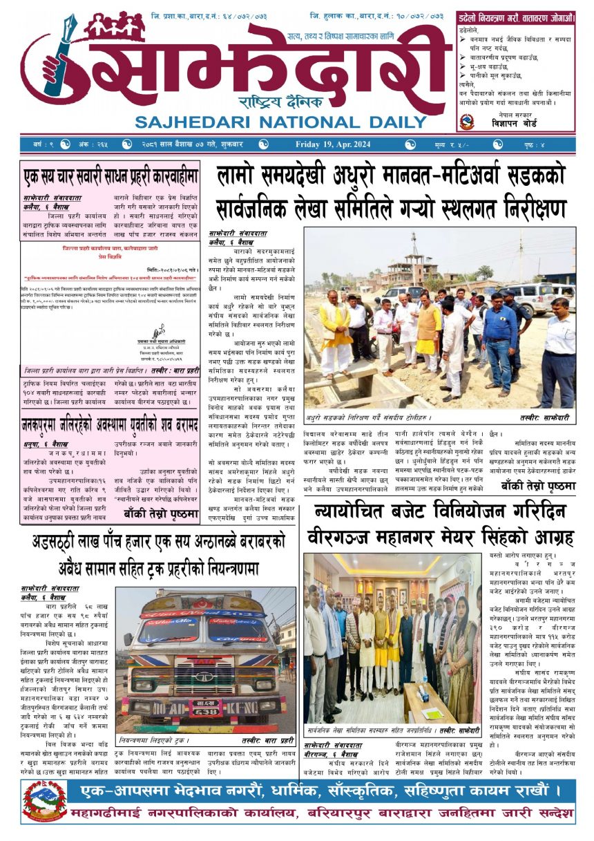 ई–पेपर २०८१ वैशाख ०७ गते । साझेदारी दैनिक साझेदारी दैनिक २०८१ बैशाख ७, गते 989 पाठक संख्या शेयर २०८१ वैशाख ०७ गते । साझेदारी दैनिक शेयर Leave a review Leave a review Leave a Review Cancel replyYour email address will not be published. Required fields are marked * Please select a rating! Your Rating Rate… Perfect Good Average Not that Bad Very Poor Your Comment *नाम * Your Email * Your website Save my name, email, and website in this browser for the next time I comment. ताजा अपडेट आमामाथि कुटपिट गरी भाग्दै गरेका युवक अफिमसहित पक्राउ मधेश समाचार पर्सामा ३० हजार ट्रामाडोल ट्याब्लेटसहित भारतीय नागरिक पक्राउ मधेश समाचार तेइस लाख बालकालिकालाई भिटामिन ‘ए’ खुवाइयो समाचार स्वास्थ्य पर्सामा लागूऔषध गाँजा जस्तो पदार्थसहित चार भारतीय नागरिक पक्राउ मधेश समाचार चक्कु प्रहार गरी युवकको हत्या समाचार बनावटी अडियो काण्ड : प्रहरी वरिष्ठ नायव निरीक्षक सागर शमसेर ज.ब.रा. निलम्बन प्रक्रियामा मधेश मुख्य समाचार समाचार १९ औं स्थापना दिवसको अवसरमा ३७ जनाद्वारा रक्तदान मधेश समाचार मुख्य समाचार वीरगञ्ज भन्सारद्वारा नौ महिनामा एक खर्ब ७७ करोड राजस्व सङ्कलन मधेश समाचार व्यवसाय सञ्चालनमा पारदर्शिता र नियम पालना गर्न जीतपुरसिमरा उद्योग वाणिज्य संघको आग्रह मधेश समाचार पथलैया-चुरियामाई सडक क्षेत्रका संरचना हटाउन ३ दिनको अल्टिमेटम मधेश मुख्य समाचार समाचार सिमरामा ‘केआईईसी’को नयाँ शाखा सञ्चालन,विदेश अध्ययन चाहने विद्यार्थीलाई सहज मधेश मुख्य समाचार समाचार पहिलेको निर्णय फेरियो : कलैयामा अब वैशाख १६ देखि कक्षा सुरु हुने मधेश मुख्य समाचार समाचार प्रदेश समाचार कलैयामा वैशाख १५ गतेदेखि भर्ना अभियान, २१ गतेदेखि पठनपाठन सुरु हुने मधेश मुख्य समाचार समाचार पर्सा राष्ट्रिय निकुञ्जमा वन्यजन्तु उद्धार केन्द्र उद्घाटन मधेश समाचार कलैयामा खसी मासुको छालासहित र बिना छालाको छुट्टाछुट्टै मूल्य निर्धारण मधेश समाचार सिम्रौनगढमा छाडा कुकुरको आतंक : एकै घरका ८ खसी-बाख्रा मरे मधेश मुख्य समाचार समाचार रेल्वे सेवा ७९ करोड ऋणमा मधेश समाचार