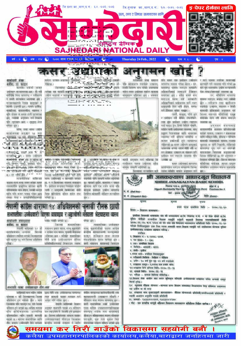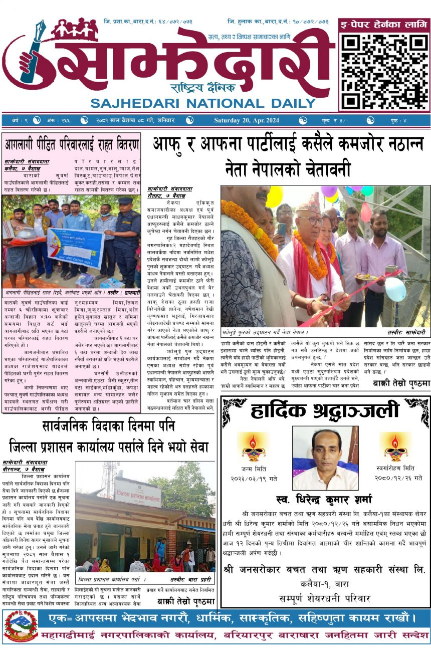 ई–पेपर २०८१ वैशाख ०८ गते । साझेदारी दैनिक साझेदारी दैनिक २०८१ बैशाख ८, गते 1.1k पाठक संख्या शेयर २०८१ वैशाख ०८ गते । साझेदारी दैनिक शेयर Leave a review Leave a review Leave a Review Cancel replyYour email address will not be published. Required fields are marked * Please select a rating! Your Rating Rate… Perfect Good Average Not that Bad Very Poor Your Comment *नाम * Your Email * Your website Save my name, email, and website in this browser for the next time I comment. ताजा अपडेट बृन्दावनमा ६ सुकुम्बासी परिवार विस्थापित मधेश समाचार सुनसरीमा काँचो केरासहित चार जना पक्राउ मधेश मुख्य समाचार समाचार २०८३ वैशाख ०५ गते । साझेदारी दैनिक ई–पेपर दुर्घटना न्यूनीकरणलाई केन्द्रमा राखेर काम गर्न डीआईजी थपलियाको निर्देशन मधेश मुख्य समाचार समाचार कलैयामा घरको ताला तोडेर करिब ५० लाख बराबरको चोरी मधेश मुख्य समाचार समाचार प्रधानमन्त्री कप क्रिकेटको उपाधि त्रिभुवन आर्मी क्लबलाई खेलकुद मधेश मुख्य समाचार समाचार लागुऔषधसहित विभिन्न स्थानबाट २४ जना पक्राउ प्रदेश समाचार समाचार मुख्य समाचार भन्सार छली प्रकरणः तीन जनाविरुद्ध अदालतमा मुद्दा, मुख्य अभियुक्तबाट २ करोडभन्दा बढी बिगो दाबी मधेश मुख्य समाचार समाचार जीतपुरको गौशाला जग्गा अतिक्रमण घरटहरा हटाइयो मधेश मुख्य समाचार समाचार बारामा भूतपूर्व सैनिक पुनर्मिलन कार्यक्रम सम्पन्न मधेश समाचार पाँच पटक भन्दाबढी ट्राफिक नियम उल्लंघन गर्नेको लाइसेन्स निलम्बन प्रक्रिया सुरु मधेश मुख्य समाचार समाचार बाराका दुई नगरपालिकामा नयाँ प्रमुख प्रशासकीय अधिकृत खटाइए मधेश मुख्य समाचार समाचार प्रदेश समाचार पर्सामा नागरिकतासँगै राष्ट्रिय परिचयपत्र मधेश मुख्य समाचार समाचार राजश्व अनुसन्धान कार्यालय पथलैयामा आगलागी, प्रमुखको कार्यकक्ष ध्वस्त मधेश समाचार भाडा वृद्धि पछि सिमरा-काठमाडौं उडानमा यात्रु घटे मधेश मुख्य समाचार समाचार बारामा साढे दुई महिनामा एक करोडभन्दा बढीको अवैध सामान बरामद मधेश मुख्य समाचार समाचार सांसद साहलाई जीतपुरसिमरा-१७ का वडाबासीद्वारा ध्यानाकर्षणपत्र बुझाइयो मधेश मुख्य समाचार समाचार