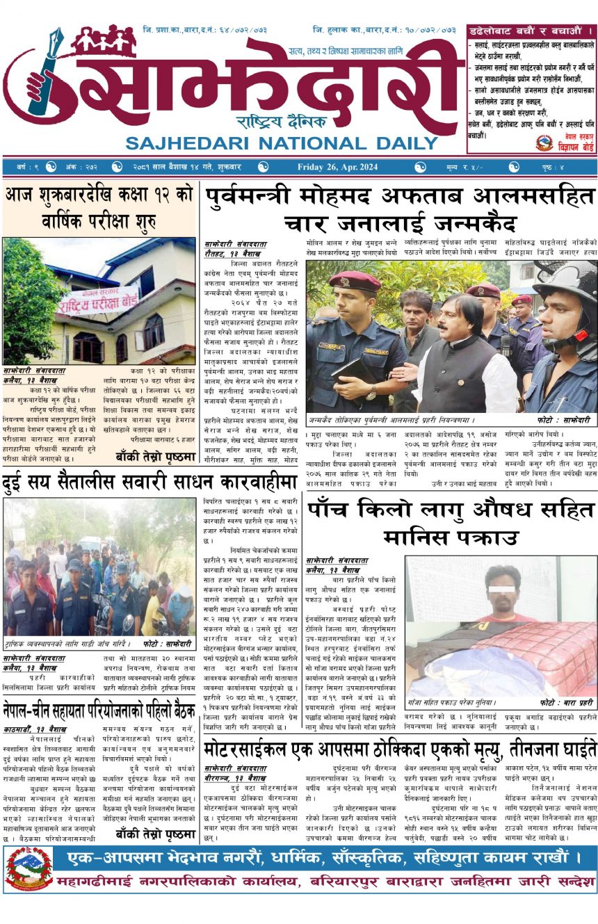 ई–पेपर २०८१ वैशाख १४ गते । साझेदारी दैनिक साझेदारी दैनिक २०८१ बैशाख १४, गते 274 पाठक संख्या शेयर २०८१ वैशाख १४ गते । साझेदारी दैनिक शेयर Leave a review Leave a review Leave a Review Cancel replyYour email address will not be published. Required fields are marked * Please select a rating! Your Rating Rate… Perfect Good Average Not that Bad Very Poor Your Comment *नाम * Your Email * Your website Save my name, email, and website in this browser for the next time I comment. ताजा अपडेट दुर्घटना न्यूनीकरणलाई केन्द्रमा राखेर काम गर्न डीआईजी थपलियाको निर्देशन मधेश मुख्य समाचार समाचार कलैयामा घरको ताला तोडेर करिब ५० लाख बराबरको चोरी मधेश मुख्य समाचार समाचार प्रधानमन्त्री कप क्रिकेटको उपाधि त्रिभुवन आर्मी क्लबलाई खेलकुद मधेश मुख्य समाचार समाचार लागुऔषधसहित विभिन्न स्थानबाट २४ जना पक्राउ प्रदेश समाचार समाचार सुनचाँदीको मूल्य घट्यो समाचार भन्सार छली प्रकरणः तीन जनाविरुद्ध अदालतमा मुद्दा, मुख्य अभियुक्तबाट २ करोडभन्दा बढी बिगो दाबी मधेश मुख्य समाचार समाचार जीतपुरको गौशाला जग्गा अतिक्रमण घरटहरा हटाइयो मधेश मुख्य समाचार समाचार मुख्य समाचार बारामा भूतपूर्व सैनिक पुनर्मिलन कार्यक्रम सम्पन्न मधेश समाचार पाँच पटक भन्दाबढी ट्राफिक नियम उल्लंघन गर्नेको लाइसेन्स निलम्बन प्रक्रिया सुरु मधेश मुख्य समाचार समाचार बाराका दुई नगरपालिकामा नयाँ प्रमुख प्रशासकीय अधिकृत खटाइए मधेश मुख्य समाचार समाचार पर्सामा नागरिकतासँगै राष्ट्रिय परिचयपत्र मधेश मुख्य समाचार समाचार राजश्व अनुसन्धान कार्यालय पथलैयामा आगलागी, प्रमुखको कार्यकक्ष ध्वस्त मधेश समाचार प्रदेश समाचार भाडा वृद्धि पछि सिमरा-काठमाडौं उडानमा यात्रु घटे मधेश मुख्य समाचार समाचार बारामा साढे दुई महिनामा एक करोडभन्दा बढीको अवैध सामान बरामद मधेश मुख्य समाचार समाचार सांसद साहलाई जीतपुरसिमरा-१७ का वडाबासीद्वारा ध्यानाकर्षणपत्र बुझाइयो मधेश मुख्य समाचार समाचार प्रधानमन्त्री कपको आजको खेलमा मधेस प्रदेश विजयी खेलकुद मधेश समाचार स्थानीय तहसँग मागियो विद्यालय समायोजनको विवरण प्रदेश समाचार समाचार