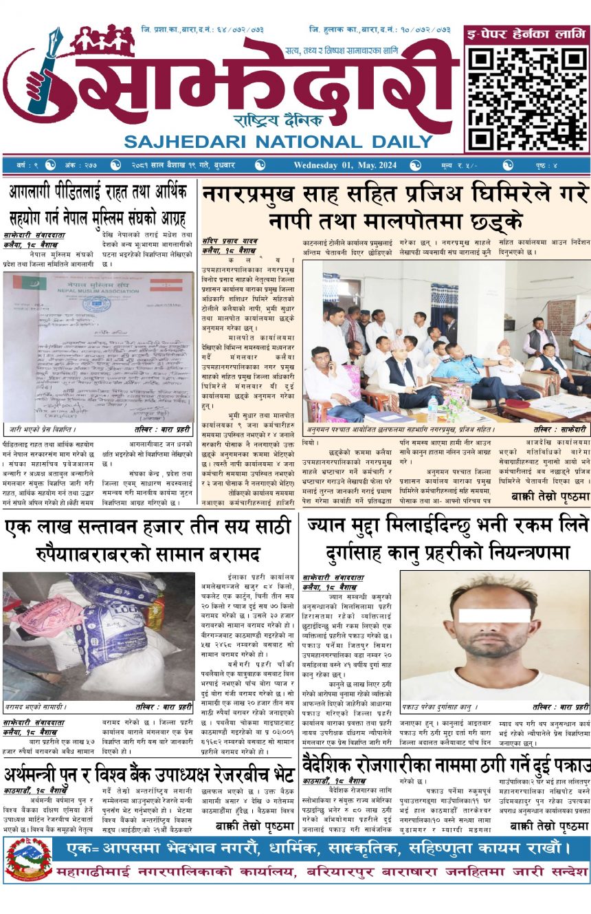 ई–पेपर २०८१ वैशाख १९ गते । साझेदारी दैनिक साझेदारी दैनिक २०८१ बैशाख १९, गते 248 पाठक संख्या शेयर २०८१ वैशाख १९ गते । साझेदारी दैनिक शेयर Leave a review Leave a review Leave a Review Cancel replyYour email address will not be published. Required fields are marked * Please select a rating! Your Rating Rate… Perfect Good Average Not that Bad Very Poor Your Comment *नाम * Your Email * Your website Save my name, email, and website in this browser for the next time I comment. ताजा अपडेट २०८३ वैशाख ०५ गते । साझेदारी दैनिक ई–पेपर दुर्घटना न्यूनीकरणलाई केन्द्रमा राखेर काम गर्न डीआईजी थपलियाको निर्देशन मधेश मुख्य समाचार समाचार कलैयामा घरको ताला तोडेर करिब ५० लाख बराबरको चोरी मधेश मुख्य समाचार समाचार प्रधानमन्त्री कप क्रिकेटको उपाधि त्रिभुवन आर्मी क्लबलाई खेलकुद मधेश मुख्य समाचार समाचार लागुऔषधसहित विभिन्न स्थानबाट २४ जना पक्राउ प्रदेश समाचार समाचार सुनचाँदीको मूल्य घट्यो समाचार भन्सार छली प्रकरणः तीन जनाविरुद्ध अदालतमा मुद्दा, मुख्य अभियुक्तबाट २ करोडभन्दा बढी बिगो दाबी मधेश मुख्य समाचार समाचार मुख्य समाचार जीतपुरको गौशाला जग्गा अतिक्रमण घरटहरा हटाइयो मधेश मुख्य समाचार समाचार बारामा भूतपूर्व सैनिक पुनर्मिलन कार्यक्रम सम्पन्न मधेश समाचार पाँच पटक भन्दाबढी ट्राफिक नियम उल्लंघन गर्नेको लाइसेन्स निलम्बन प्रक्रिया सुरु मधेश मुख्य समाचार समाचार बाराका दुई नगरपालिकामा नयाँ प्रमुख प्रशासकीय अधिकृत खटाइए मधेश मुख्य समाचार समाचार पर्सामा नागरिकतासँगै राष्ट्रिय परिचयपत्र मधेश मुख्य समाचार समाचार प्रदेश समाचार राजश्व अनुसन्धान कार्यालय पथलैयामा आगलागी, प्रमुखको कार्यकक्ष ध्वस्त मधेश समाचार भाडा वृद्धि पछि सिमरा-काठमाडौं उडानमा यात्रु घटे मधेश मुख्य समाचार समाचार बारामा साढे दुई महिनामा एक करोडभन्दा बढीको अवैध सामान बरामद मधेश मुख्य समाचार समाचार सांसद साहलाई जीतपुरसिमरा-१७ का वडाबासीद्वारा ध्यानाकर्षणपत्र बुझाइयो मधेश मुख्य समाचार समाचार प्रधानमन्त्री कपको आजको खेलमा मधेस प्रदेश विजयी खेलकुद मधेश समाचार