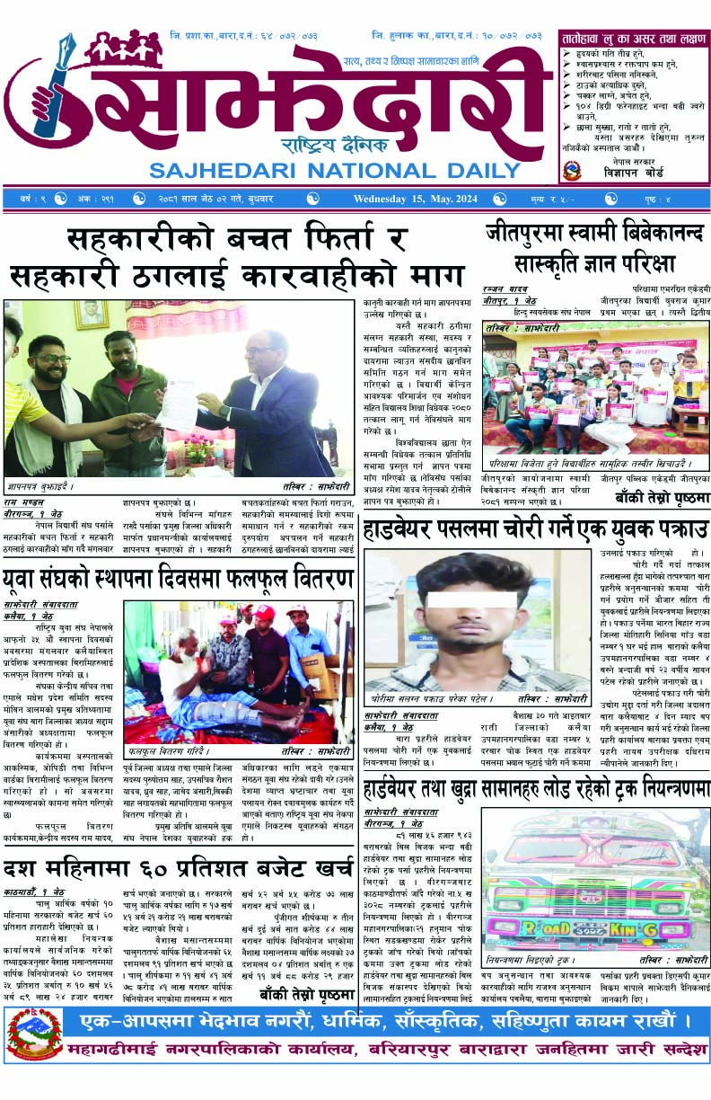 ई–पेपर २०८१ जेठ ०२ गते । साझेदारी दैनिक साझेदारी दैनिक २०८१ जेष्ठ २, गते 210 पाठक संख्या शेयर शेयर Leave a review Leave a review Leave a Review Cancel replyYour email address will not be published. Required fields are marked * Please select a rating! Your Rating Rate… Perfect Good Average Not that Bad Very Poor Your Comment *नाम * Your Email * Your website Save my name, email, and website in this browser for the next time I comment. ताजा अपडेट मानमत-कलैया-मटिअर्वा सडकको ठेक्का सप्तकोशी-ओम साई जेभीसँग तोडियो मधेश मुख्य समाचार समाचार जीतपुरसिमरा उपमहानगरमा अटो, ई–रिक्सा र टेम्पो दर्तामा उदासीनता मधेश मुख्य समाचार समाचार २०८३ वैशाख ११ गते । साझेदारी दैनिक ई–पेपर राष्ट्रभन्दा माथि व्यक्तिगत स्वार्थ हुन सक्दैन : डिआईजी कृष्ण ढकाल मधेश मुख्य समाचार समाचार खानेपानी डिभिजन कार्यालय बाराका तत्कालीन निमित्त प्रमुख यादवविरुद्ध १ करोडभन्दा बढीको भ्रष्टाचार मुद्दा मधेश मुख्य समाचार समाचार सिमरामा भ्रष्टाचार नियन्त्रण तथा सुशासन प्रवद्र्धनबारे अन्तरक्रिया सम्पन्न मधेश समाचार मनसुन र आगलागी सचेतनामा समुदाय सशक्त बनाउँदै लुमन्ती मधेश समाचार मुख्य समाचार कलैयाका नगर प्रहरी किन बन्छन् बारम्बार उग्र? भर्ना प्रक्रियामै प्रश्नचिह्न, तालिमविहीन दस्ताले बजारमा मच्चाउँछ आतंक मधेश मुख्य समाचार समाचार महेन्द्र राजमार्ग क्षेत्रका वन अतिक्रमण हटाउन ३ दिने अल्टिमेटम मधेश मुख्य समाचार समाचार गृहमन्त्री गुरुङद्वारा राजीनामा घोषणा मधेश समाचार वातावरणीय स्वीकृति बिना जथाभावी नदीजन्य पदार्थ उत्खनन नगर्न वनको निर्देशन मधेश मुख्य समाचार समाचार कलैयाका व्यवसायीमाथि नगर प्रहरीको बर्बरता: पसलभित्रै छिरेर व्यवसायीलाई लछारपछार मधेश मुख्य समाचार समाचार प्रदेश समाचार आमामाथि कुटपिट गरी भाग्दै गरेका युवक अफिमसहित पक्राउ मधेश समाचार पर्सामा ३० हजार ट्रामाडोल ट्याब्लेटसहित भारतीय नागरिक पक्राउ मधेश समाचार पर्सामा लागूऔषध गाँजा जस्तो पदार्थसहित चार भारतीय नागरिक पक्राउ मधेश समाचार बनावटी अडियो काण्ड : प्रहरी वरिष्ठ नायव निरीक्षक सागर शमसेर ज.ब.रा. निलम्बन प्रक्रियामा मधेश मुख्य समाचार समाचार १९ औं स्थापना दिवसको अवसरमा ३७ जनाद्वारा रक्तदान मधेश समाचार