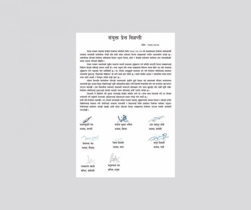 विज्ञप्ति जारी गर्नेमा पत्रकार महासंघ पर्सा जिल्लाका अध्यक्ष अनुप तिवारी,बाराका अध्यक्ष रेशम तिवारी,रौतहटका अध्यक्ष प्रेमचन्द्र झा, सप्तरीका अध्यक्ष श्रवणकुमार देव,सिरहाका अध्यक्ष मनोजकुमार वनैता,सर्लाहीका अध्यक्ष टंकबहादुर क्षेत्री,महोत्तरीका सचिव राजकरण महतो,धनुषाका सचिव वटुकनाथ झाले संयुक्त प्रेस विज्ञप्ति जारी गरेका हुन् ।