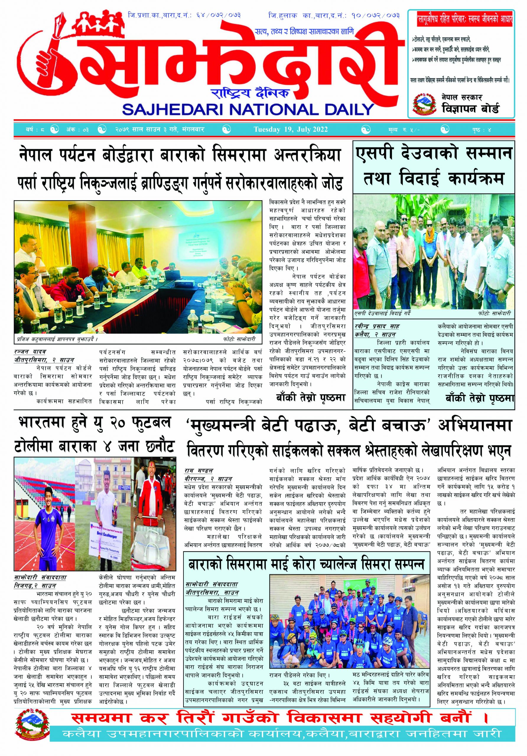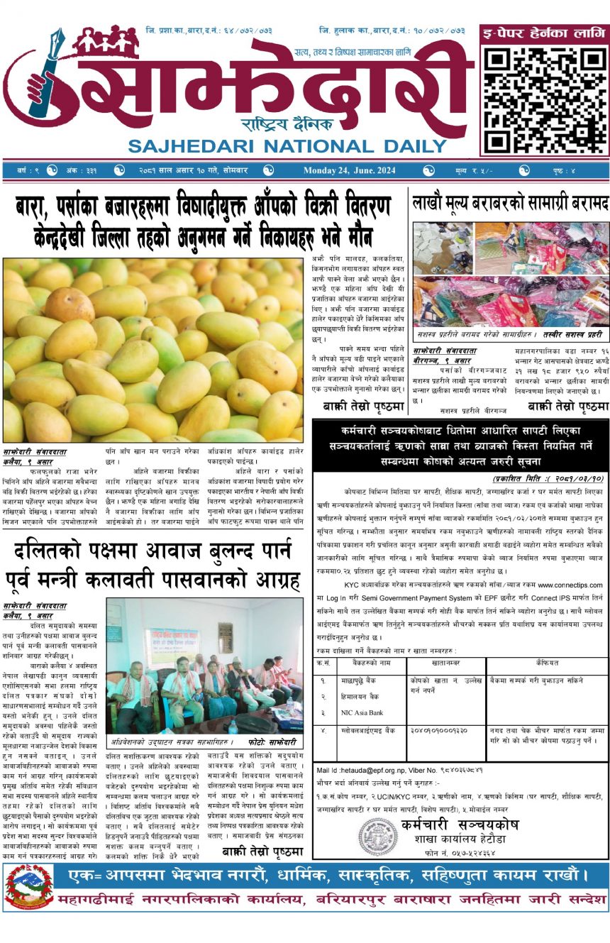 ई–पेपर २०८१ असार १० गते । साझेदारी दैनिक साझेदारी दैनिक २०८१ असार १०, गते 364 पाठक संख्या शेयर २०८१ असार १० गते । साझेदारी दैनिक शेयर Leave a review Leave a review Leave a Review Cancel replyYour email address will not be published. Required fields are marked * Please select a rating! Your Rating Rate… Perfect Good Average Not that Bad Very Poor Your Comment *नाम * Your Email * Your website Save my name, email, and website in this browser for the next time I comment. ताजा अपडेट हावाहुरी र असिनाले निलकण्ठवामा ३ घरमा क्षति मधेश मुख्य समाचार समाचार २०८३ वैशाख १४ गते । साझेदारी दैनिक ई–पेपर रौतहटमा गुणस्तरहीन निर्माण कार्य भएको भन्दै स्थानीयद्वारा विरोध ,काका ठेकेदार भतिजा ईन्जिनियर मधेश मुख्य समाचार समाचार गण्डक नहर किनारका अतिक्रमित संरचना हटाउन थालियो मधेश समाचार कलैया : बसपार्कबाटै सवारी चलाउने निर्णय अझै कार्यान्वयन भएन मधेश मुख्य समाचार समाचार सुनचाँदीको मुल्य आज बढ्यो समाचार मनोहरा सुकुमवासी बस्तीमा घरटहरा भत्काउन सुरु समाचार मुख्य समाचार खुला नाकाबाट सोझै वीरगन्ज भित्रिन्छ भारतीय तरकारी मधेश समाचार मधुवनमा काठसहित एक जना पक्राउ मधेश समाचार सेज क्षेत्रको अतिक्रमण हटाउने प्रक्रिया तीव्र हुँदै,५ सय बिघा जमिन फिर्ता लिन सरकारको दबाब मधेश मुख्य समाचार समाचार कलवारको नेतृत्वमा शान्ति युवा मञ्चको नयाँ समिति गठन मधेश समाचार अत्याधिक गर्मीलाई मध्यनजर गर्दै कलैयामा निःशुल्क पानी र शरबत वितरण मधेश समाचार प्रदेश समाचार कलैयामा अब सबै रुटका सवारी बसपार्कबाट मात्र सञ्चालन हुने मधेश मुख्य समाचार समाचार बिजुली, पानी र विवाह रकम भुक्तानीको माग गर्दै मौलापुर नगरपालिकाविरुद्ध आन्दोलन घोषणा मधेश समाचार थापाथलीको सुकुमबासी बस्ती खाली गरियो बागमती समाचार वीरगञ्जबाट पेट्रोलियम आयात, साठी अर्ब अठतीस करोड राजस्व सङ्कलन मधेश समाचार पथलैयामा ओभरलोड सवारीमाथि एक्सनः दुई दिनमै ६ गाडी कारवाहीमा मधेश मुख्य समाचार समाचार