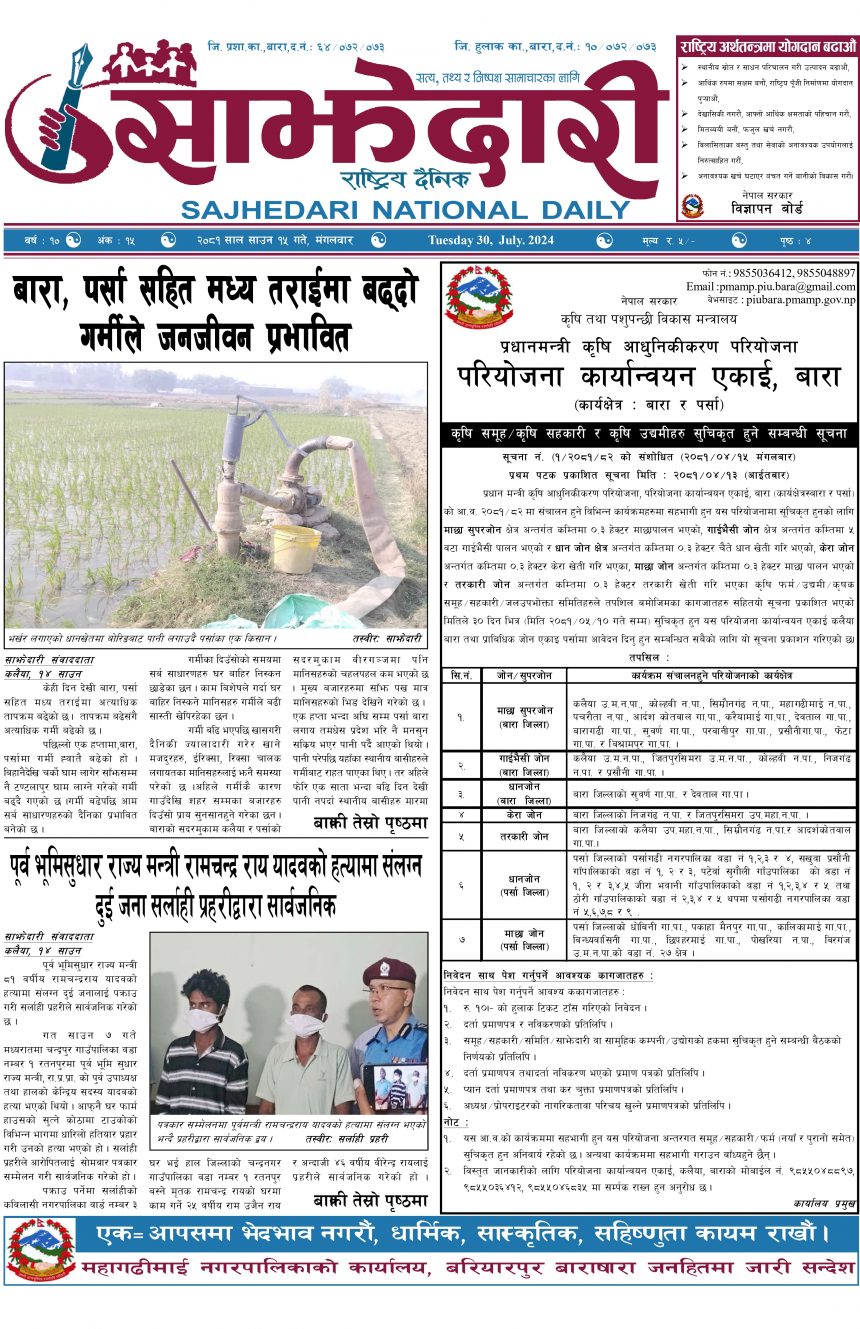 ई–पेपर २०८१ साउन १५ गते । साझेदारी दैनिक साझेदारी दैनिक २०८१ श्रावण १५, गते 237 पाठक संख्या शेयर शेयर Leave a review Leave a review Leave a Review Cancel replyYour email address will not be published. Required fields are marked * Please select a rating! Your Rating Rate… Perfect Good Average Not that Bad Very Poor Your Comment *नाम * Your Email * Your website Save my name, email, and website in this browser for the next time I comment. ताजा अपडेट दुर्घटना न्यूनीकरणलाई केन्द्रमा राखेर काम गर्न डीआईजी थपलियाको निर्देशन मधेश मुख्य समाचार समाचार कलैयामा घरको ताला तोडेर करिब ५० लाख बराबरको चोरी मधेश मुख्य समाचार समाचार प्रधानमन्त्री कप क्रिकेटको उपाधि त्रिभुवन आर्मी क्लबलाई खेलकुद मधेश मुख्य समाचार समाचार लागुऔषधसहित विभिन्न स्थानबाट २४ जना पक्राउ प्रदेश समाचार समाचार सुनचाँदीको मूल्य घट्यो समाचार भन्सार छली प्रकरणः तीन जनाविरुद्ध अदालतमा मुद्दा, मुख्य अभियुक्तबाट २ करोडभन्दा बढी बिगो दाबी मधेश मुख्य समाचार समाचार जीतपुरको गौशाला जग्गा अतिक्रमण घरटहरा हटाइयो मधेश मुख्य समाचार समाचार मुख्य समाचार बारामा भूतपूर्व सैनिक पुनर्मिलन कार्यक्रम सम्पन्न मधेश समाचार पाँच पटक भन्दाबढी ट्राफिक नियम उल्लंघन गर्नेको लाइसेन्स निलम्बन प्रक्रिया सुरु मधेश मुख्य समाचार समाचार बाराका दुई नगरपालिकामा नयाँ प्रमुख प्रशासकीय अधिकृत खटाइए मधेश मुख्य समाचार समाचार पर्सामा नागरिकतासँगै राष्ट्रिय परिचयपत्र मधेश मुख्य समाचार समाचार राजश्व अनुसन्धान कार्यालय पथलैयामा आगलागी, प्रमुखको कार्यकक्ष ध्वस्त मधेश समाचार प्रदेश समाचार भाडा वृद्धि पछि सिमरा-काठमाडौं उडानमा यात्रु घटे मधेश मुख्य समाचार समाचार बारामा साढे दुई महिनामा एक करोडभन्दा बढीको अवैध सामान बरामद मधेश मुख्य समाचार समाचार सांसद साहलाई जीतपुरसिमरा-१७ का वडाबासीद्वारा ध्यानाकर्षणपत्र बुझाइयो मधेश मुख्य समाचार समाचार प्रधानमन्त्री कपको आजको खेलमा मधेस प्रदेश विजयी खेलकुद मधेश समाचार स्थानीय तहसँग मागियो विद्यालय समायोजनको विवरण प्रदेश समाचार समाचार