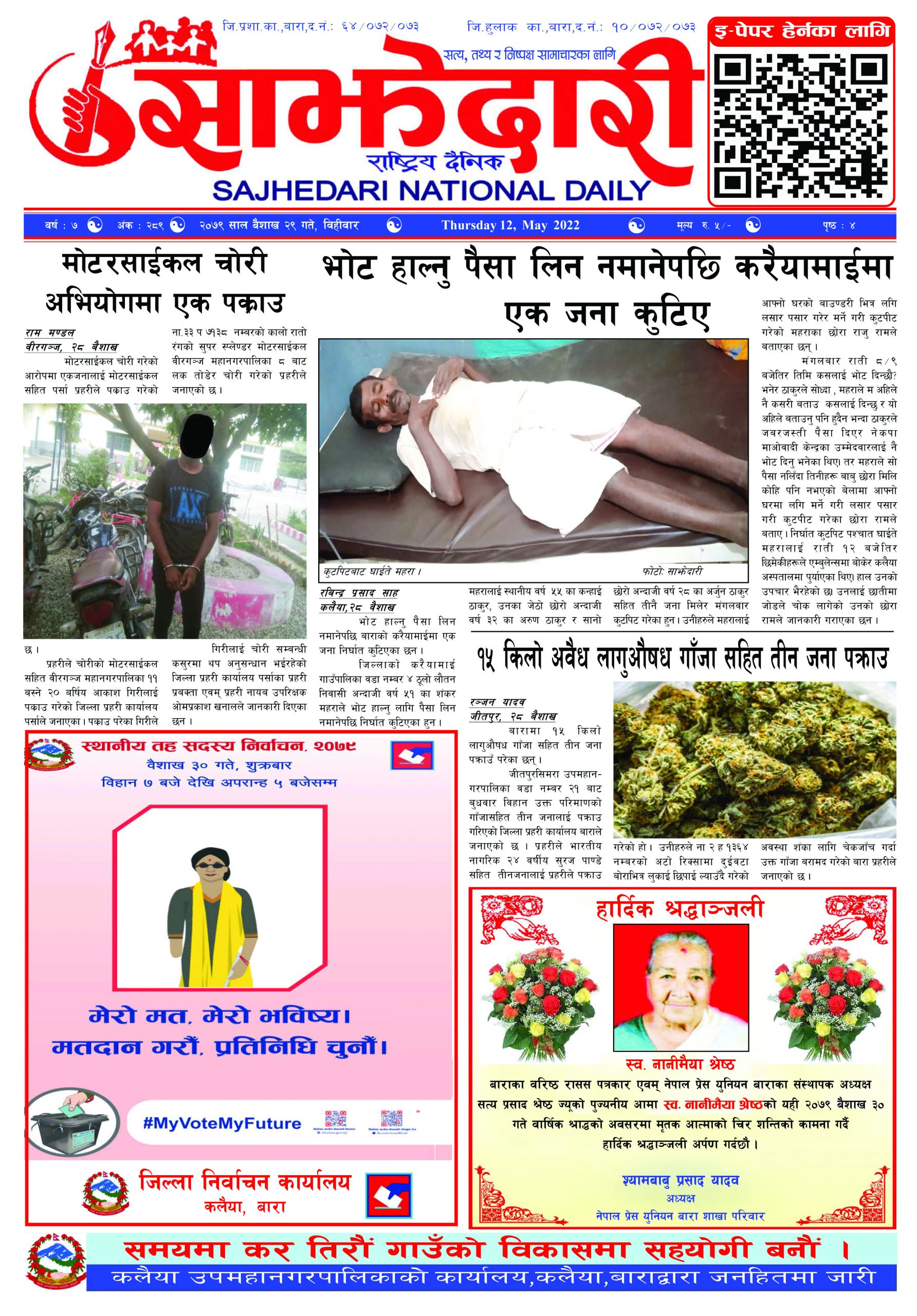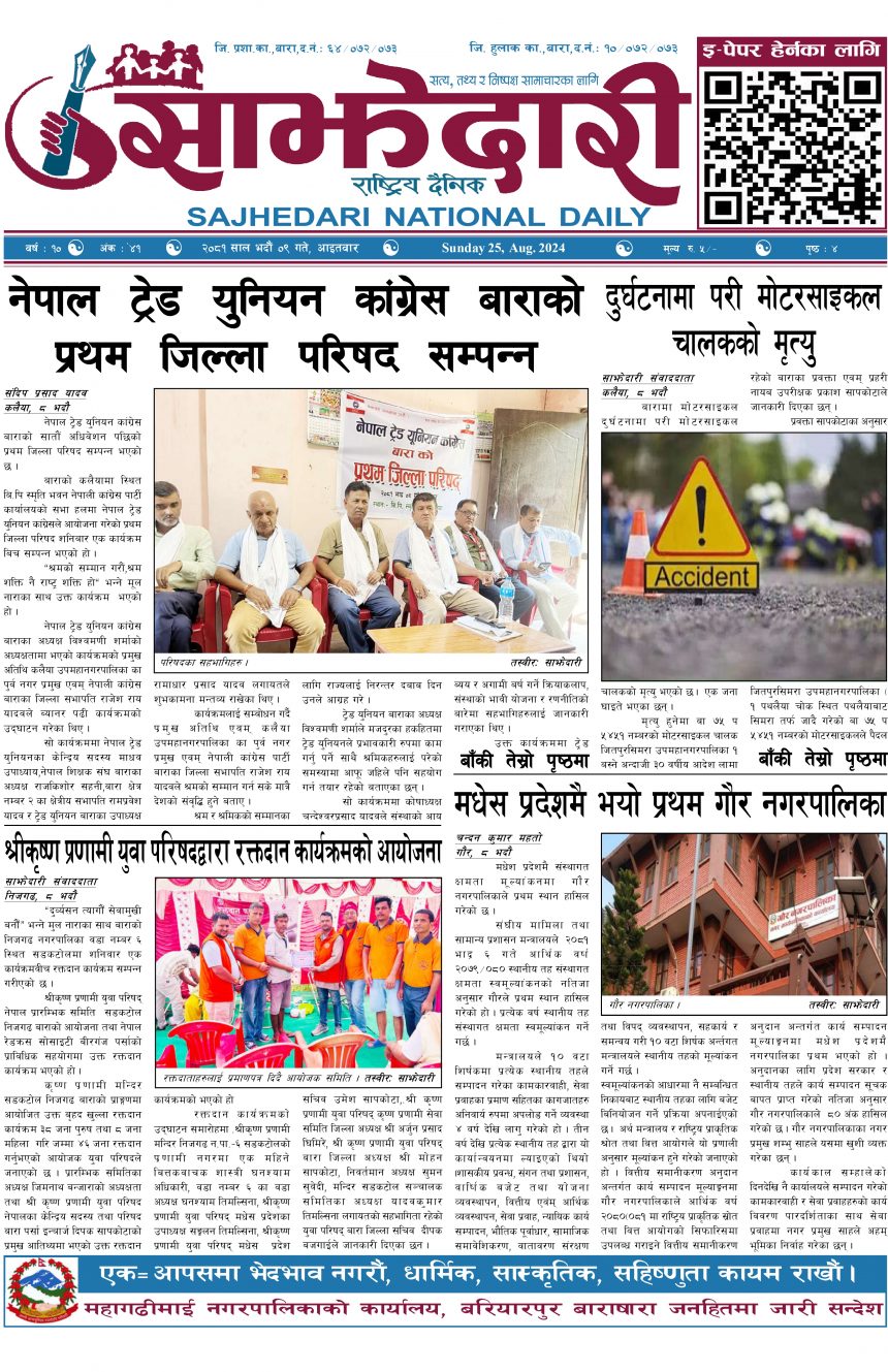 ई–पेपर २०८१ भदौ ०९ गते । साझेदारी दैनिक साझेदारी दैनिक २०८१ भाद्र ९, गते 209 पाठक संख्या शेयर शेयर Leave a review Leave a review Leave a Review Cancel replyYour email address will not be published. Required fields are marked * Please select a rating! Your Rating Rate… Perfect Good Average Not that Bad Very Poor Your Comment *नाम * Your Email * Your website Save my name, email, and website in this browser for the next time I comment. ताजा अपडेट २०८३ वैशाख ०५ गते । साझेदारी दैनिक ई–पेपर दुर्घटना न्यूनीकरणलाई केन्द्रमा राखेर काम गर्न डीआईजी थपलियाको निर्देशन मधेश मुख्य समाचार समाचार कलैयामा घरको ताला तोडेर करिब ५० लाख बराबरको चोरी मधेश मुख्य समाचार समाचार प्रधानमन्त्री कप क्रिकेटको उपाधि त्रिभुवन आर्मी क्लबलाई खेलकुद मधेश मुख्य समाचार समाचार लागुऔषधसहित विभिन्न स्थानबाट २४ जना पक्राउ प्रदेश समाचार समाचार सुनचाँदीको मूल्य घट्यो समाचार भन्सार छली प्रकरणः तीन जनाविरुद्ध अदालतमा मुद्दा, मुख्य अभियुक्तबाट २ करोडभन्दा बढी बिगो दाबी मधेश मुख्य समाचार समाचार मुख्य समाचार जीतपुरको गौशाला जग्गा अतिक्रमण घरटहरा हटाइयो मधेश मुख्य समाचार समाचार बारामा भूतपूर्व सैनिक पुनर्मिलन कार्यक्रम सम्पन्न मधेश समाचार पाँच पटक भन्दाबढी ट्राफिक नियम उल्लंघन गर्नेको लाइसेन्स निलम्बन प्रक्रिया सुरु मधेश मुख्य समाचार समाचार बाराका दुई नगरपालिकामा नयाँ प्रमुख प्रशासकीय अधिकृत खटाइए मधेश मुख्य समाचार समाचार पर्सामा नागरिकतासँगै राष्ट्रिय परिचयपत्र मधेश मुख्य समाचार समाचार प्रदेश समाचार राजश्व अनुसन्धान कार्यालय पथलैयामा आगलागी, प्रमुखको कार्यकक्ष ध्वस्त मधेश समाचार भाडा वृद्धि पछि सिमरा-काठमाडौं उडानमा यात्रु घटे मधेश मुख्य समाचार समाचार बारामा साढे दुई महिनामा एक करोडभन्दा बढीको अवैध सामान बरामद मधेश मुख्य समाचार समाचार सांसद साहलाई जीतपुरसिमरा-१७ का वडाबासीद्वारा ध्यानाकर्षणपत्र बुझाइयो मधेश मुख्य समाचार समाचार प्रधानमन्त्री कपको आजको खेलमा मधेस प्रदेश विजयी खेलकुद मधेश समाचार