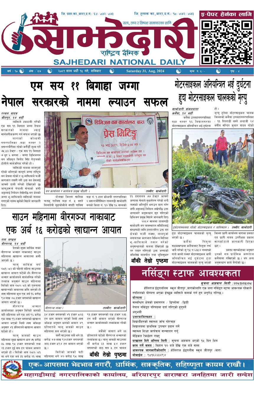 ई–पेपर २०८१ भदौ १५ गते । साझेदारी दैनिक साझेदारी दैनिक २०८१ भाद्र १५, गते 260 पाठक संख्या शेयर शेयर Leave a review Leave a review Leave a Review Cancel replyYour email address will not be published. Required fields are marked * Please select a rating! Your Rating Rate… Perfect Good Average Not that Bad Very Poor Your Comment *नाम * Your Email * Your website Save my name, email, and website in this browser for the next time I comment. ताजा अपडेट रौतहटमा गुणस्तरहीन निर्माण कार्य भएको भन्दै स्थानीयद्वारा विरोध ,काका ठेकेदार भतिजा ईन्जिनियर मधेश मुख्य समाचार समाचार गण्डक नहर किनारका अतिक्रमित संरचना हटाउन थालियो मधेश समाचार कलैया : बसपार्कबाटै सवारी चलाउने निर्णय अझै कार्यान्वयन भएन मधेश मुख्य समाचार समाचार सुनचाँदीको मुल्य आज बढ्यो समाचार मनोहरा सुकुमवासी बस्तीमा घरटहरा भत्काउन सुरु समाचार खुला नाकाबाट सोझै वीरगन्ज भित्रिन्छ भारतीय तरकारी मधेश समाचार मधुवनमा काठसहित एक जना पक्राउ मधेश समाचार मुख्य समाचार सेज क्षेत्रको अतिक्रमण हटाउने प्रक्रिया तीव्र हुँदै,५ सय बिघा जमिन फिर्ता लिन सरकारको दबाब मधेश मुख्य समाचार समाचार कलवारको नेतृत्वमा शान्ति युवा मञ्चको नयाँ समिति गठन मधेश समाचार अत्याधिक गर्मीलाई मध्यनजर गर्दै कलैयामा निःशुल्क पानी र शरबत वितरण मधेश समाचार कलैयामा अब सबै रुटका सवारी बसपार्कबाट मात्र सञ्चालन हुने मधेश मुख्य समाचार समाचार बिजुली, पानी र विवाह रकम भुक्तानीको माग गर्दै मौलापुर नगरपालिकाविरुद्ध आन्दोलन घोषणा मधेश समाचार प्रदेश समाचार थापाथलीको सुकुमबासी बस्ती खाली गरियो बागमती समाचार वीरगञ्जबाट पेट्रोलियम आयात, साठी अर्ब अठतीस करोड राजस्व सङ्कलन मधेश समाचार पथलैयामा ओभरलोड सवारीमाथि एक्सनः दुई दिनमै ६ गाडी कारवाहीमा मधेश मुख्य समाचार समाचार सुकुम्वासी मोर्चाका कार्यवाहक अध्यक्ष परियार पक्राउ बागमती समाचार भूमिहीनलाई ३० दिनभित्र विवरण पेश गर्न वीरगञ्ज महानगरको सूचना मधेश समाचार