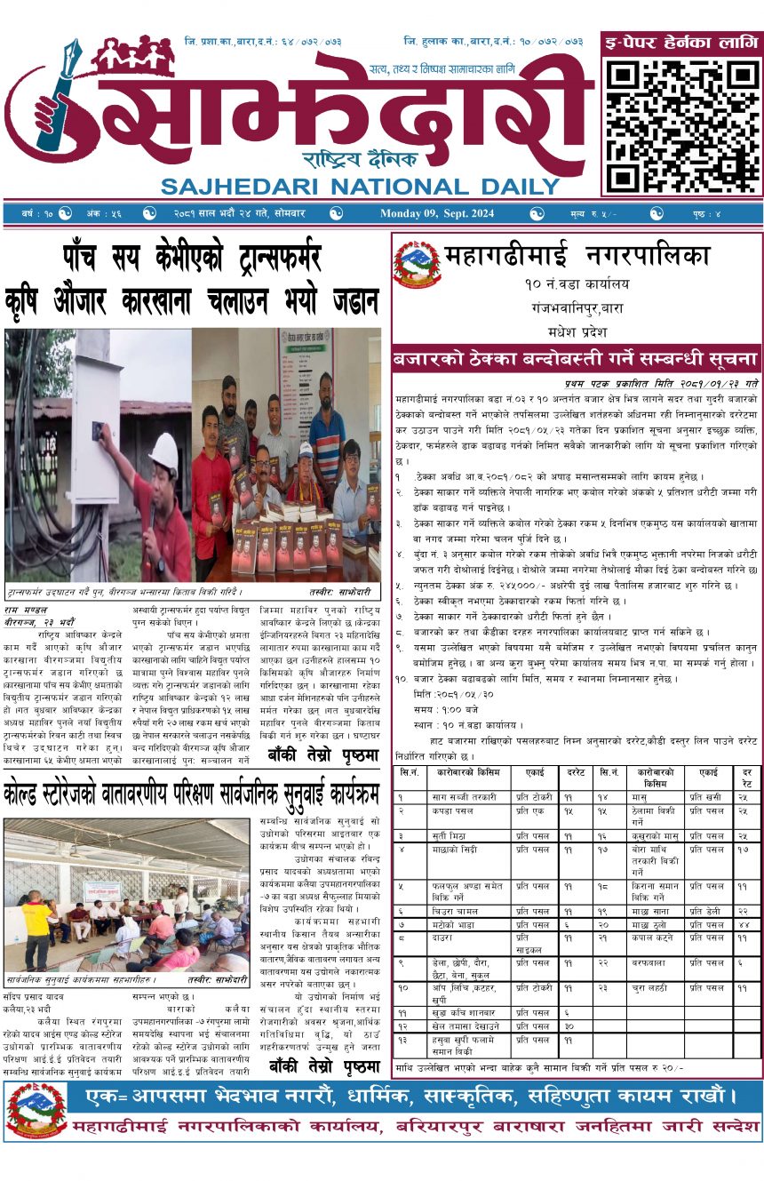 ई–पेपर २०८१ भदौ २४ गते । साझेदारी दैनिक साझेदारी दैनिक २०८१ भाद्र २४, गते 296 पाठक संख्या शेयर शेयर Leave a review Leave a review Leave a Review Cancel replyYour email address will not be published. Required fields are marked * Please select a rating! Your Rating Rate… Perfect Good Average Not that Bad Very Poor Your Comment *नाम * Your Email * Your website Save my name, email, and website in this browser for the next time I comment. ताजा अपडेट आमामाथि कुटपिट गरी भाग्दै गरेका युवक अफिमसहित पक्राउ मधेश समाचार पर्सामा ३० हजार ट्रामाडोल ट्याब्लेटसहित भारतीय नागरिक पक्राउ मधेश समाचार तेइस लाख बालकालिकालाई भिटामिन ‘ए’ खुवाइयो समाचार स्वास्थ्य पर्सामा लागूऔषध गाँजा जस्तो पदार्थसहित चार भारतीय नागरिक पक्राउ मधेश समाचार चक्कु प्रहार गरी युवकको हत्या समाचार बनावटी अडियो काण्ड : प्रहरी वरिष्ठ नायव निरीक्षक सागर शमसेर ज.ब.रा. निलम्बन प्रक्रियामा मधेश मुख्य समाचार समाचार १९ औं स्थापना दिवसको अवसरमा ३७ जनाद्वारा रक्तदान मधेश समाचार मुख्य समाचार वीरगञ्ज भन्सारद्वारा नौ महिनामा एक खर्ब ७७ करोड राजस्व सङ्कलन मधेश समाचार व्यवसाय सञ्चालनमा पारदर्शिता र नियम पालना गर्न जीतपुरसिमरा उद्योग वाणिज्य संघको आग्रह मधेश समाचार पथलैया-चुरियामाई सडक क्षेत्रका संरचना हटाउन ३ दिनको अल्टिमेटम मधेश मुख्य समाचार समाचार सिमरामा ‘केआईईसी’को नयाँ शाखा सञ्चालन,विदेश अध्ययन चाहने विद्यार्थीलाई सहज मधेश मुख्य समाचार समाचार पहिलेको निर्णय फेरियो : कलैयामा अब वैशाख १६ देखि कक्षा सुरु हुने मधेश मुख्य समाचार समाचार प्रदेश समाचार कलैयामा वैशाख १५ गतेदेखि भर्ना अभियान, २१ गतेदेखि पठनपाठन सुरु हुने मधेश मुख्य समाचार समाचार पर्सा राष्ट्रिय निकुञ्जमा वन्यजन्तु उद्धार केन्द्र उद्घाटन मधेश समाचार कलैयामा खसी मासुको छालासहित र बिना छालाको छुट्टाछुट्टै मूल्य निर्धारण मधेश समाचार सिम्रौनगढमा छाडा कुकुरको आतंक : एकै घरका ८ खसी-बाख्रा मरे मधेश मुख्य समाचार समाचार रेल्वे सेवा ७९ करोड ऋणमा मधेश समाचार