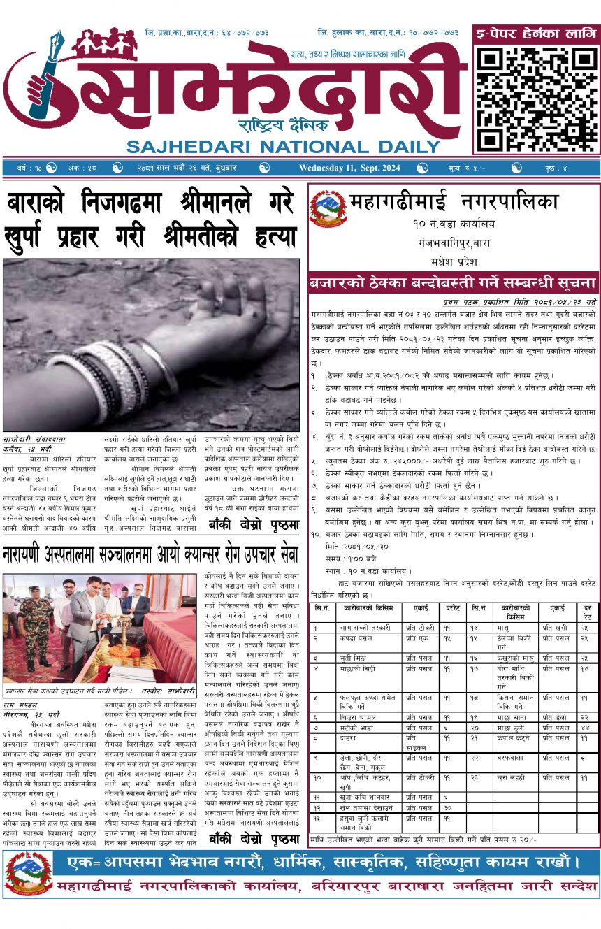 ई–पेपर २०८१ भदौ २६ गते । साझेदारी दैनिक साझेदारी दैनिक २०८१ भाद्र २६, गते 260 पाठक संख्या शेयर शेयर Leave a review Leave a review Leave a Review Cancel replyYour email address will not be published. Required fields are marked * Please select a rating! Your Rating Rate… Perfect Good Average Not that Bad Very Poor Your Comment *नाम * Your Email * Your website Save my name, email, and website in this browser for the next time I comment. ताजा अपडेट पहिलेको निर्णय फेरियो : कलैयामा अब वैशाख १६ देखि कक्षा सुरु हुने मधेश मुख्य समाचार समाचार कलैयामा वैशाख १५ गतेदेखि भर्ना अभियान, २१ गतेदेखि पठनपाठन सुरु हुने मधेश मुख्य समाचार समाचार पेट्रोलियम पदार्थमा गरिएको मूल्य वृद्धि फिर्ता लिन अध्यक्ष घिसिङको माग समाचार पर्सा राष्ट्रिय निकुञ्जमा वन्यजन्तु उद्धार केन्द्र उद्घाटन मधेश समाचार कलैयामा खसी मासुको छालासहित र बिना छालाको छुट्टाछुट्टै मूल्य निर्धारण मधेश समाचार सिम्रौनगढमा छाडा कुकुरको आतंक : एकै घरका ८ खसी-बाख्रा मरे मधेश मुख्य समाचार समाचार २०८३ वैशाख ०७ गते । साझेदारी दैनिक ई–पेपर मुख्य समाचार रेल्वे सेवा ७९ करोड ऋणमा मधेश समाचार सडक विस्तारले वीरगञ्जको विद्युत् अवरुद्ध मधेश मुख्य समाचार समाचार बाईपास विस्तारका लागि २४ घण्टाभित्र संरचना हटाउन वीरगञ्ज महानगरको निर्देशन मधेश मुख्य समाचार समाचार वीरगञ्जमा भर्ना अभियान वैशाख ७ गतेदेखि सुरु हुने मधेश समाचार वीरगन्जमा अतिक्रमित संरचना भत्काउन सुरु मधेश मुख्य समाचार समाचार प्रदेश समाचार जीतपुरसिमराको बिद्यालयमा पठनपाठन वैशाख १४ गते देखि सुरु हुने मधेश मुख्य समाचार समाचार करैयामाई -६ सिहोर्वामा नि:शुल्क स्वास्थ्य शिविर सम्पन्न मधेश समाचार स्वास्थ्य बारामा खेतबाट घर फर्किँदै गर्दा चट्याङ लागेर एक जनाको मृत्यु मधेश मुख्य समाचार समाचार बृन्दावनमा ६ सुकुम्बासी परिवार विस्थापित मधेश समाचार सुनसरीमा काँचो केरासहित चार जना पक्राउ मधेश मुख्य समाचार समाचार