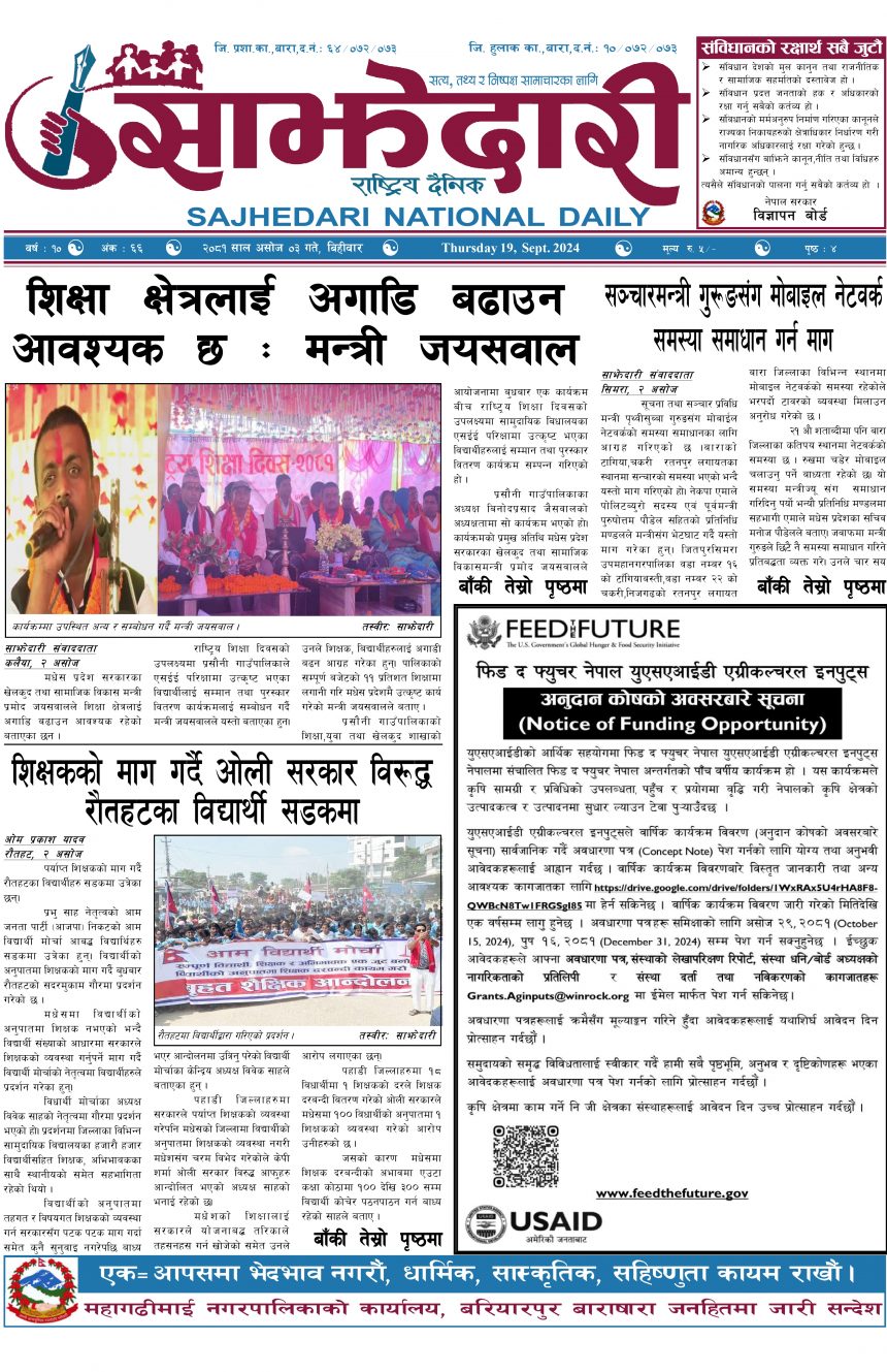 ई–पेपर २०८१ असोज ०३ गते । साझेदारी दैनिक साझेदारी दैनिक २०८१ आश्विन ३, गते 231 पाठक संख्या शेयर शेयर Leave a review Leave a review Leave a Review Cancel replyYour email address will not be published. Required fields are marked * Please select a rating! Your Rating Rate… Perfect Good Average Not that Bad Very Poor Your Comment *नाम * Your Email * Your website Save my name, email, and website in this browser for the next time I comment. ताजा अपडेट रेल्वे सेवा ७९ करोड ऋणमा मधेश समाचार सडक विस्तारले वीरगञ्जको विद्युत् अवरुद्ध मधेश मुख्य समाचार समाचार बाईपास विस्तारका लागि २४ घण्टाभित्र संरचना हटाउन वीरगञ्ज महानगरको निर्देशन मधेश मुख्य समाचार समाचार वीरगञ्जमा भर्ना अभियान वैशाख ७ गतेदेखि सुरु हुने मधेश समाचार वीरगन्जमा अतिक्रमित संरचना भत्काउन सुरु मधेश मुख्य समाचार समाचार जीतपुरसिमराको बिद्यालयमा पठनपाठन वैशाख १४ गते देखि सुरु हुने मधेश मुख्य समाचार समाचार २०८३ वैशाख ०६ गते । साझेदारी दैनिक ई–पेपर मुख्य समाचार करैयामाई -६ सिहोर्वामा नि:शुल्क स्वास्थ्य शिविर सम्पन्न मधेश समाचार स्वास्थ्य बारामा खेतबाट घर फर्किँदै गर्दा चट्याङ लागेर एक जनाको मृत्यु मधेश मुख्य समाचार समाचार बृन्दावनमा ६ सुकुम्बासी परिवार विस्थापित मधेश समाचार सुनसरीमा काँचो केरासहित चार जना पक्राउ मधेश मुख्य समाचार समाचार दुर्घटना न्यूनीकरणलाई केन्द्रमा राखेर काम गर्न डीआईजी थपलियाको निर्देशन मधेश मुख्य समाचार समाचार प्रदेश समाचार कलैयामा घरको ताला तोडेर करिब ५० लाख बराबरको चोरी मधेश मुख्य समाचार समाचार प्रधानमन्त्री कप क्रिकेटको उपाधि त्रिभुवन आर्मी क्लबलाई खेलकुद मधेश मुख्य समाचार समाचार लागुऔषधसहित विभिन्न स्थानबाट २४ जना पक्राउ प्रदेश समाचार समाचार भन्सार छली प्रकरणः तीन जनाविरुद्ध अदालतमा मुद्दा, मुख्य अभियुक्तबाट २ करोडभन्दा बढी बिगो दाबी मधेश मुख्य समाचार समाचार जीतपुरको गौशाला जग्गा अतिक्रमण घरटहरा हटाइयो मधेश मुख्य समाचार समाचार